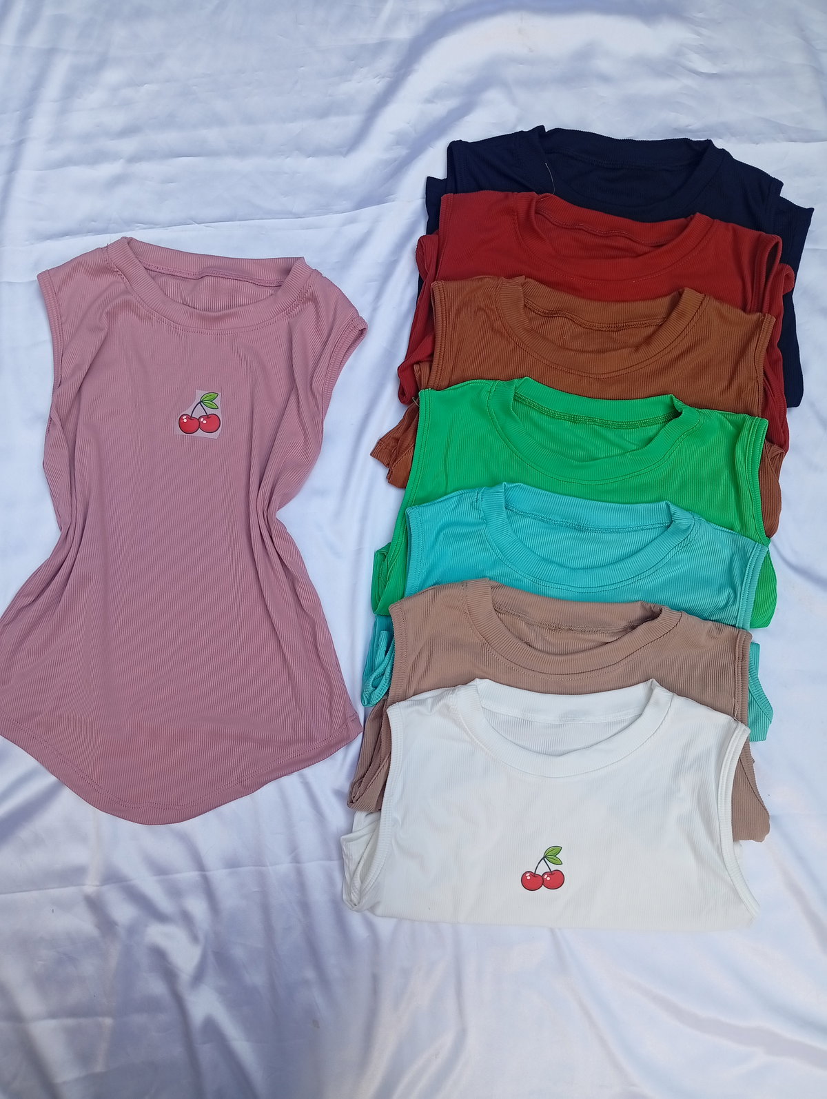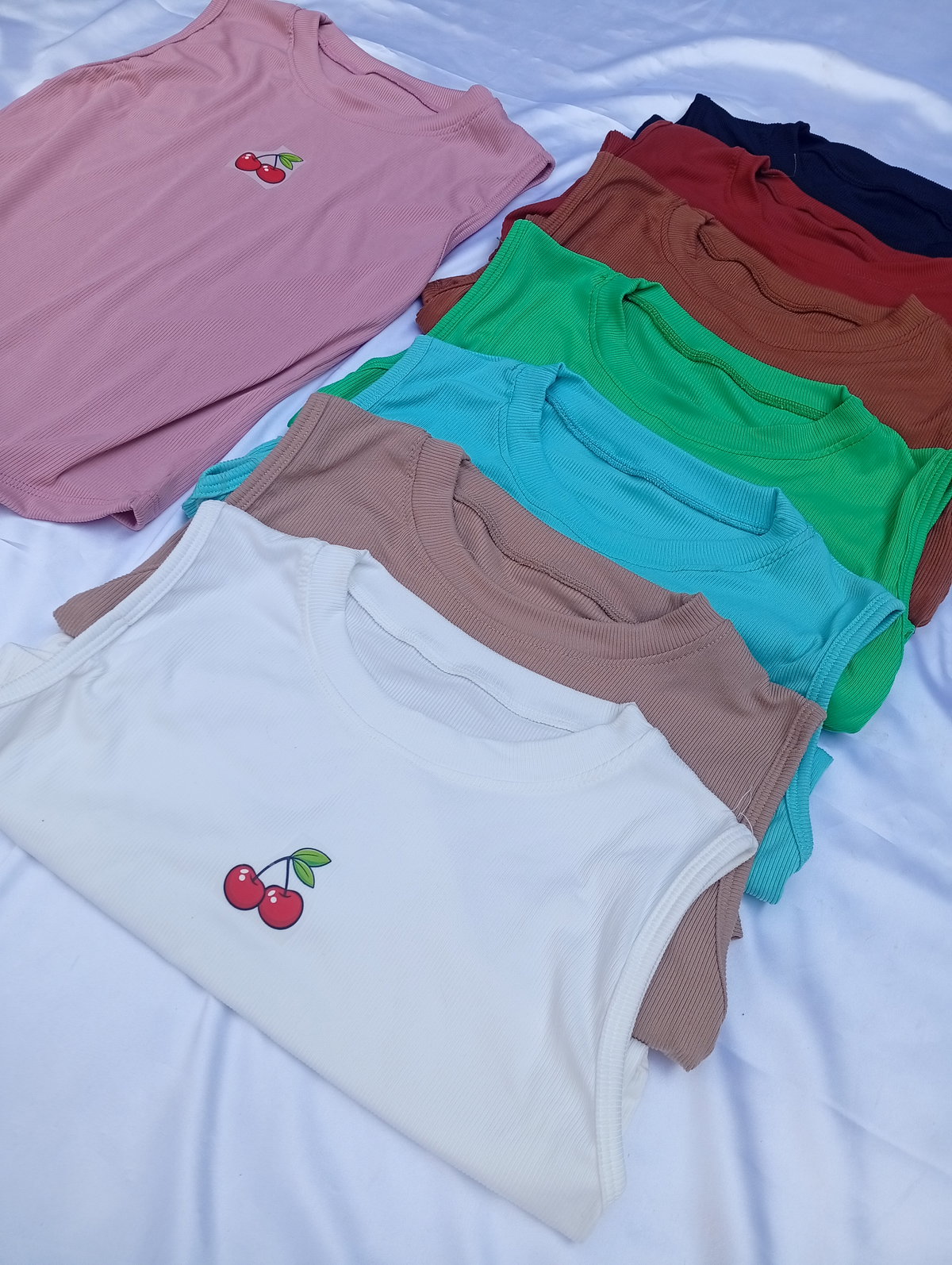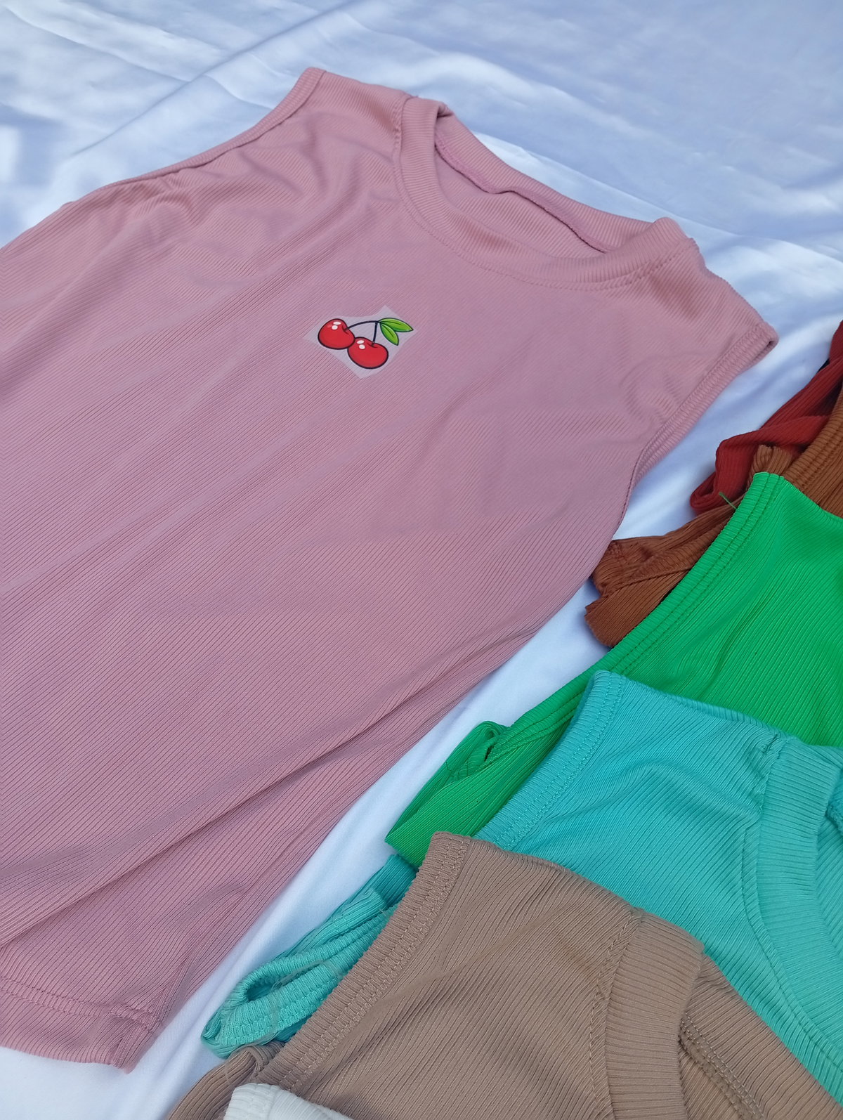 Musculosa de Morley, con cereza estampada. Es talle unico, abarca tales 85-90 (1-2), puede ser 95 (3) siempre que no tenga espalda ancha.