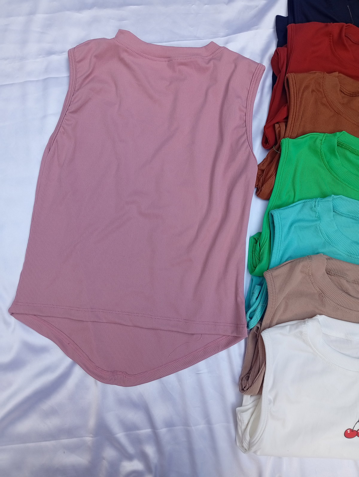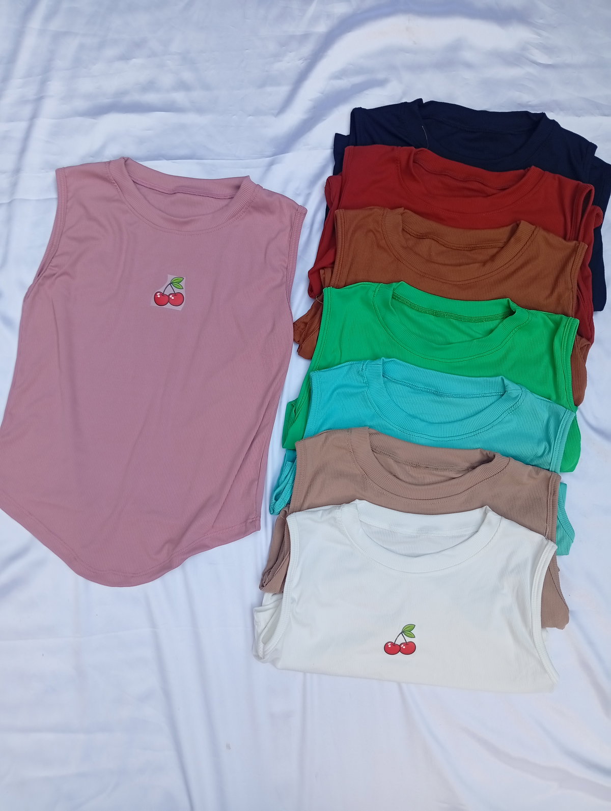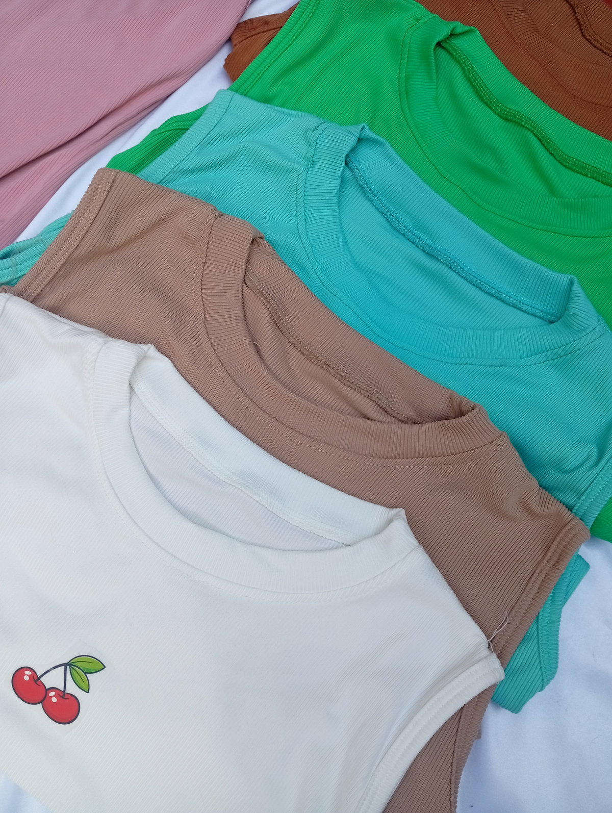 Musculosa de Morley, con cereza estampada. Es talle unico, abarca tales 85-90 (1-2), puede ser 95 (3) siempre que no tenga espalda ancha.