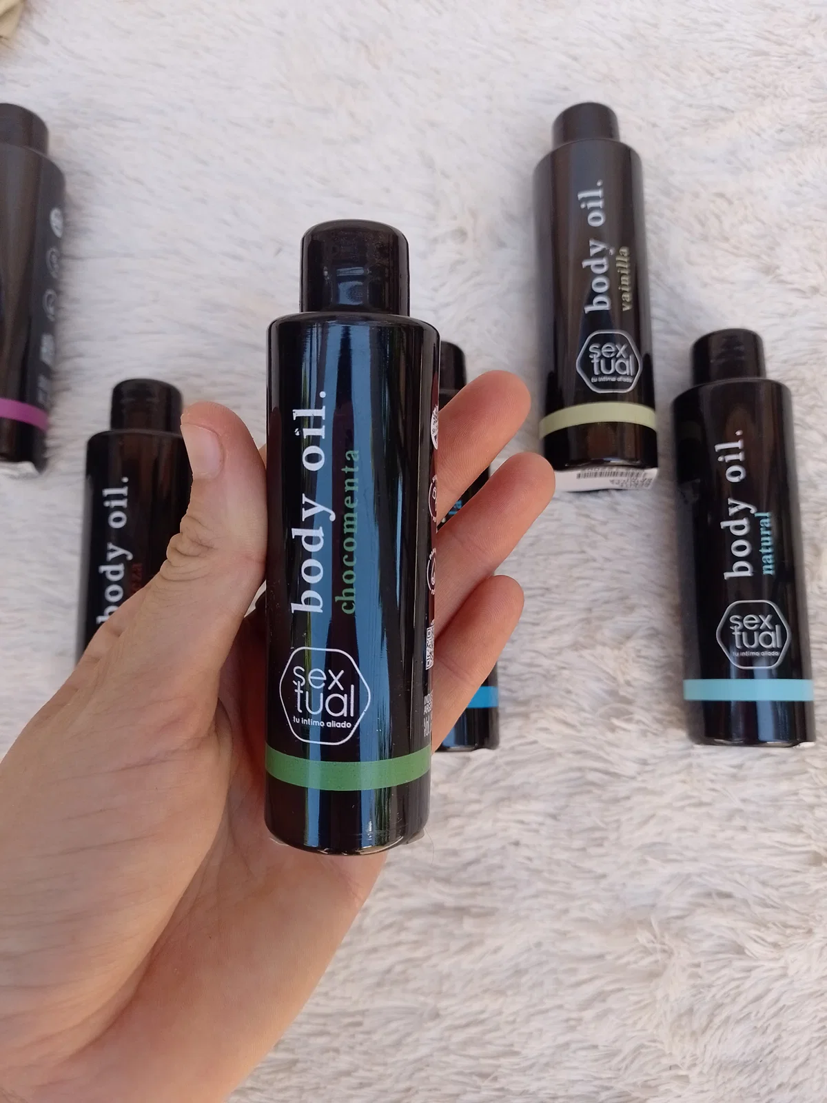 Aceite saborizado con textura sedosa, ideales para masajes sensuales y juegos previos. La frescura de la Menta y el Chocolate acompañan tu relajante intimidad. Una leve sensación de calor, acompañará tu experiencia. Disfruta junto a tu pareja de exquisitos besos. Lubrica tus zonas íntimas, sensibles y erógenas. Todo aquello que te lleve al máximo las emociones.