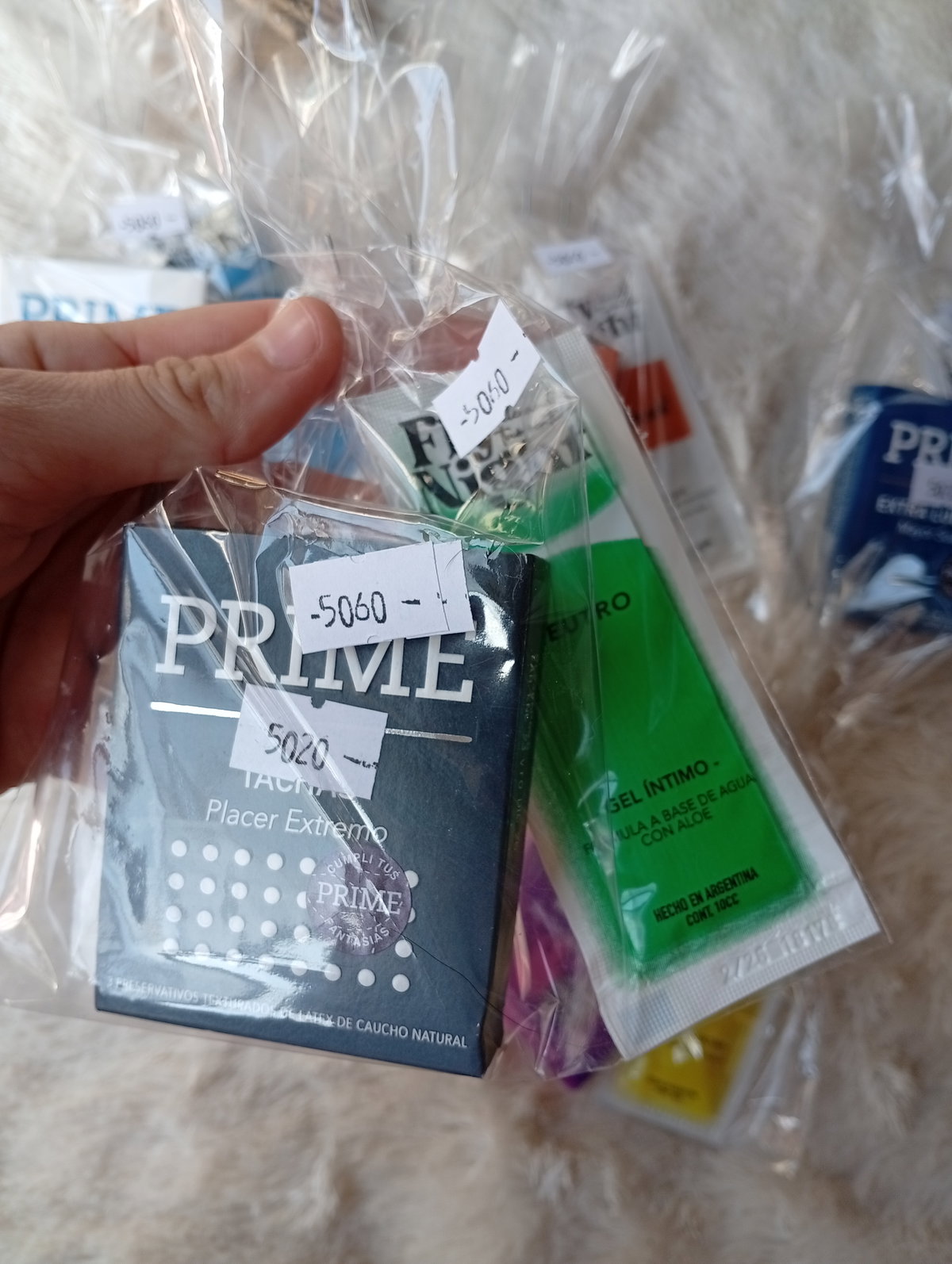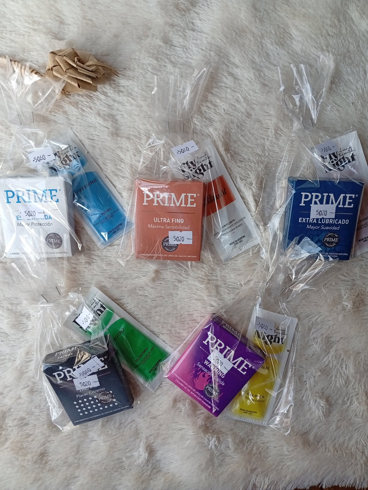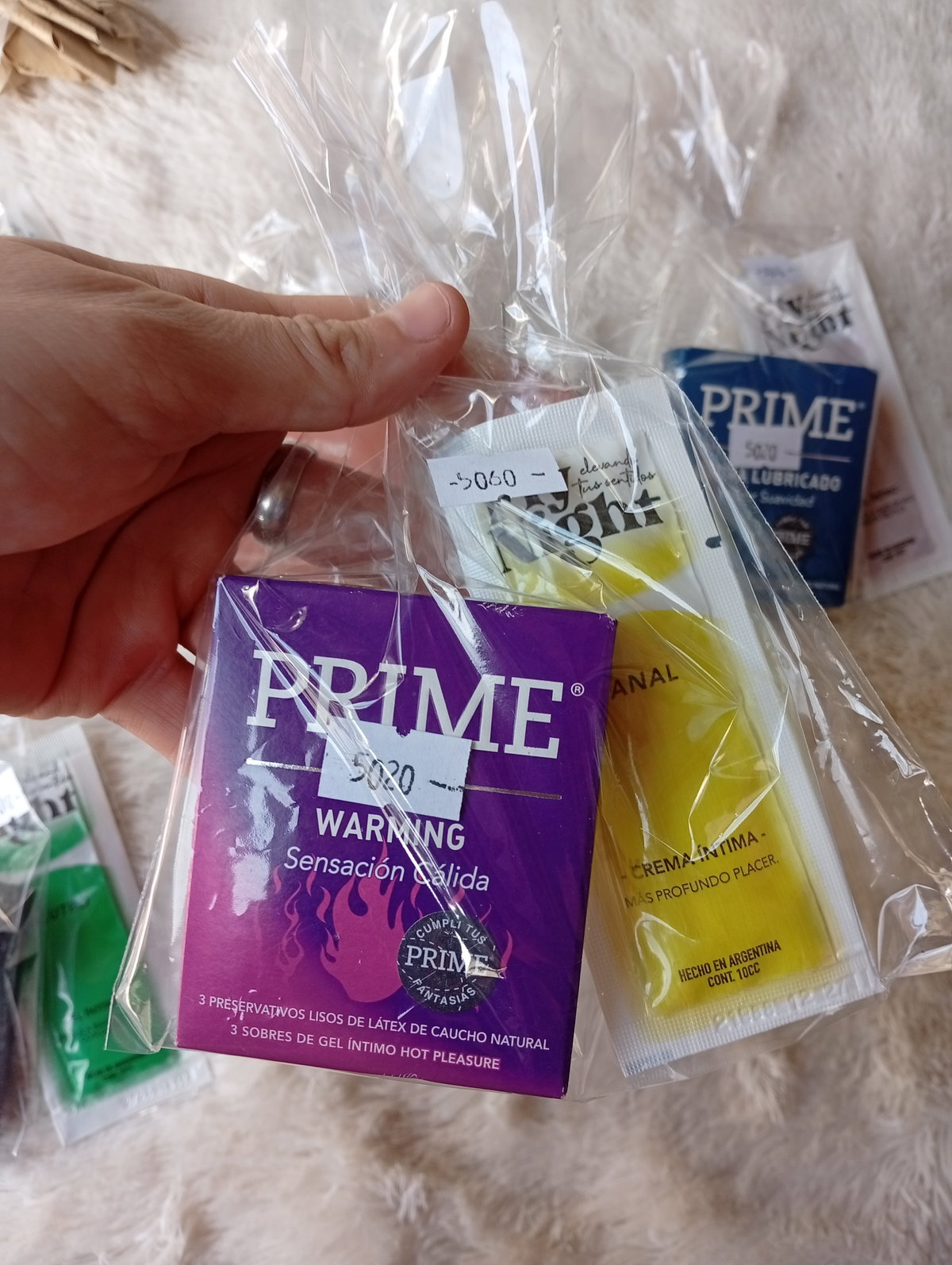 Es una caja de preservativos PRIME + un sobre de gel lubricante marca FLY NIGHT.