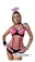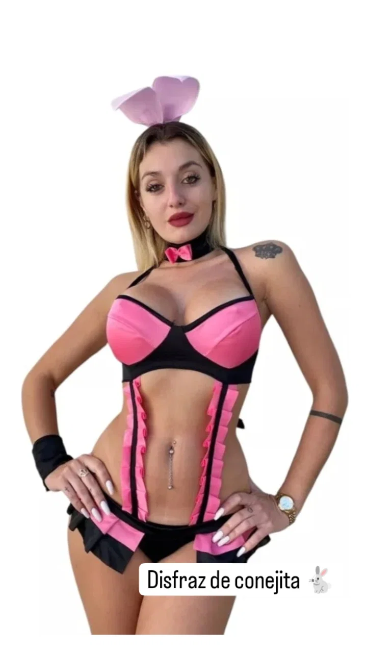 El disfraz incluye un enterizo cortillo y pollerita la pollerita tiene tanga incluida y pompón atrás vincha con orejitas y un par de muñequeras tipo mitones.