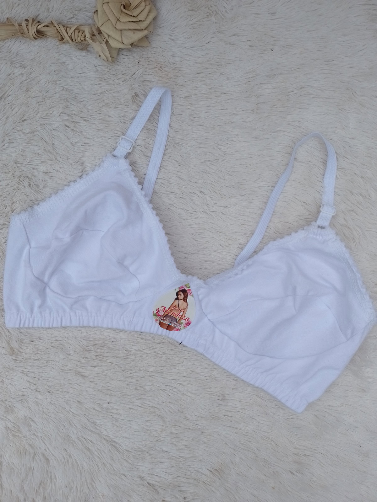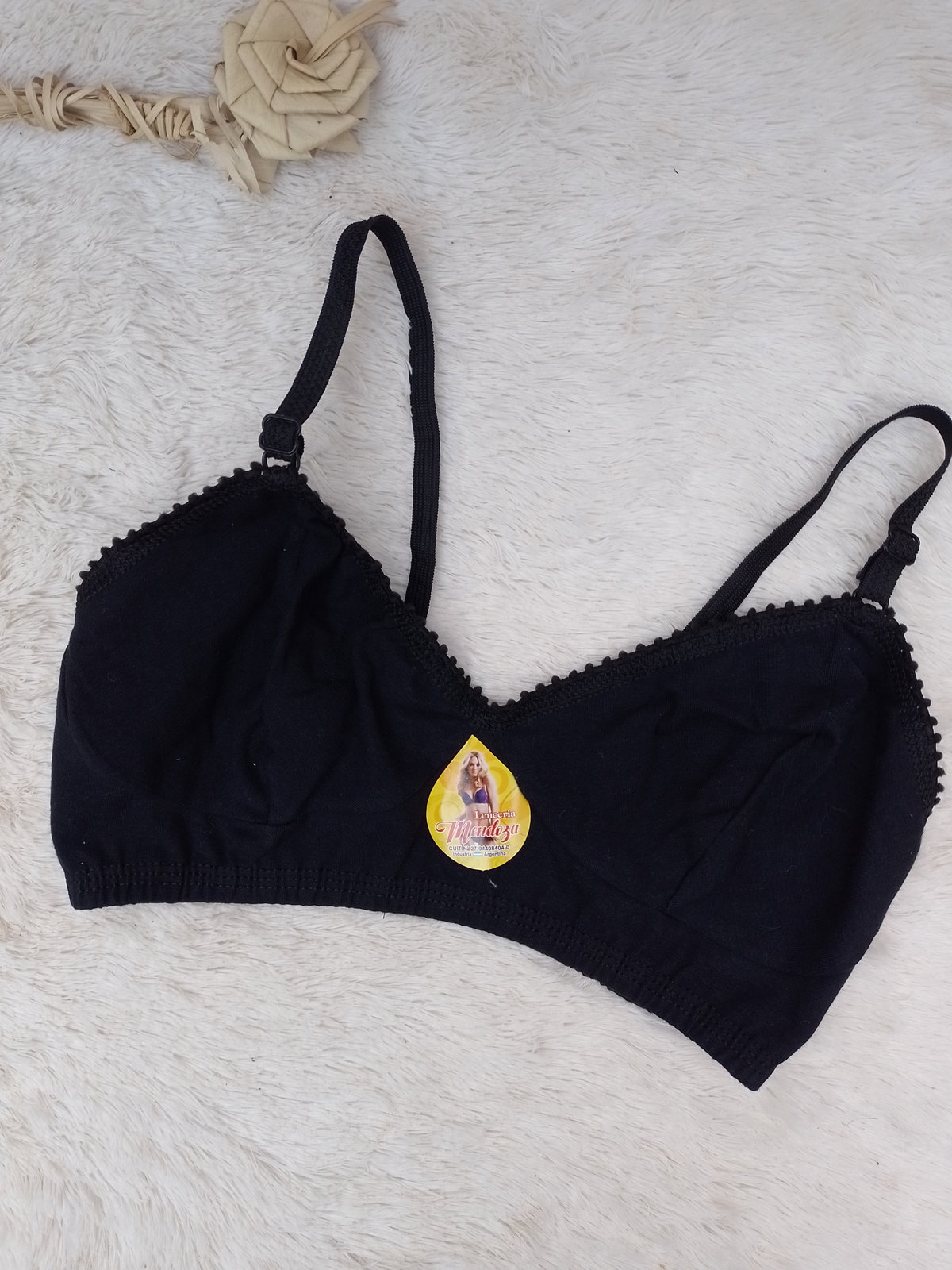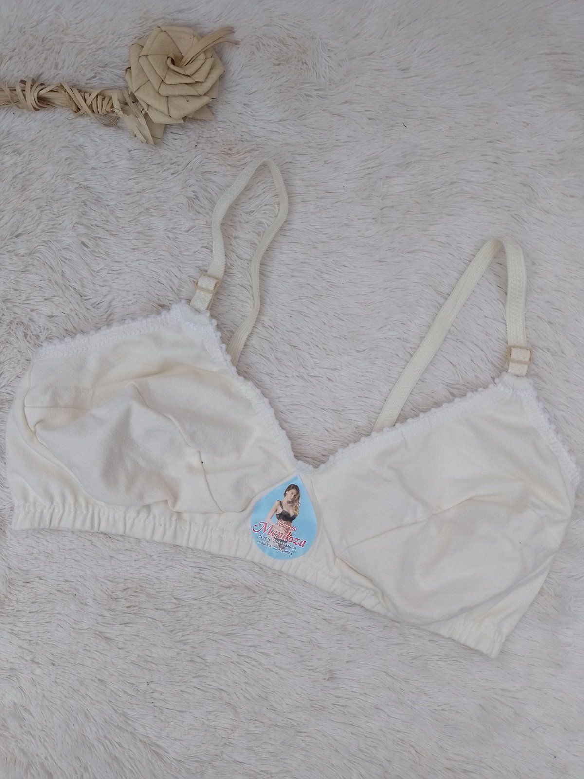 Es un corpiño simple todo de algodón sin taza sin aro tiene ganchito en la espalda.