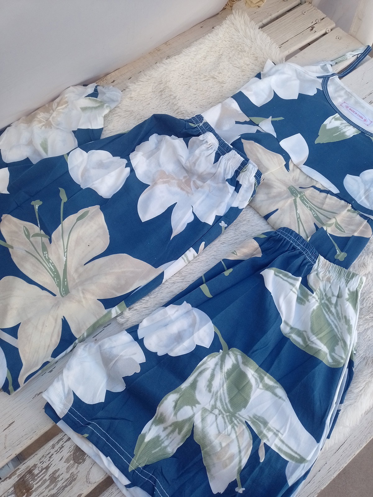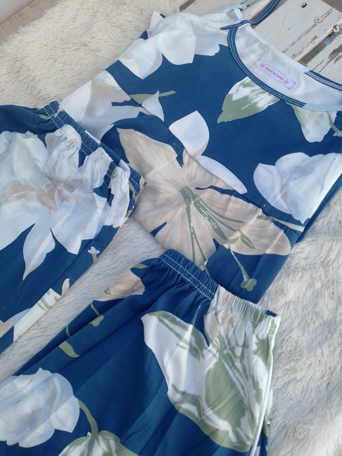 Son importados, talle unico amplio, abarca talle M al L. Son de algodon con poliester. El set es completo, remera con short y pantalon.