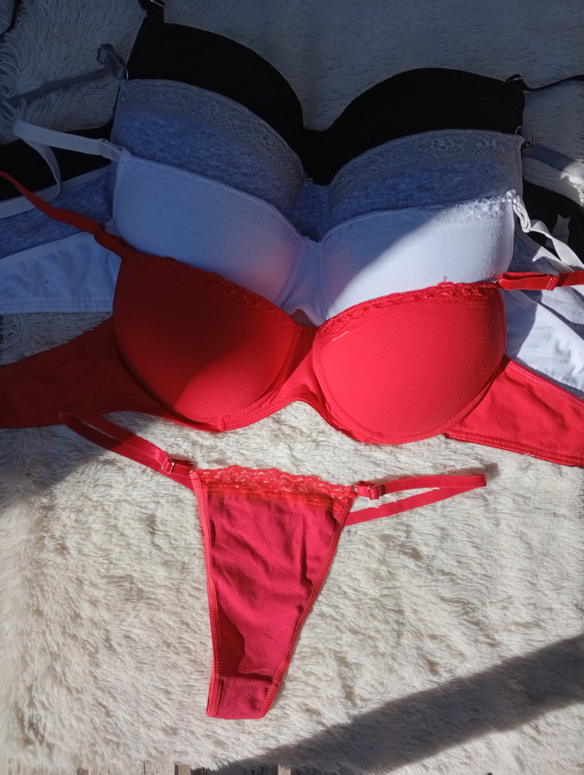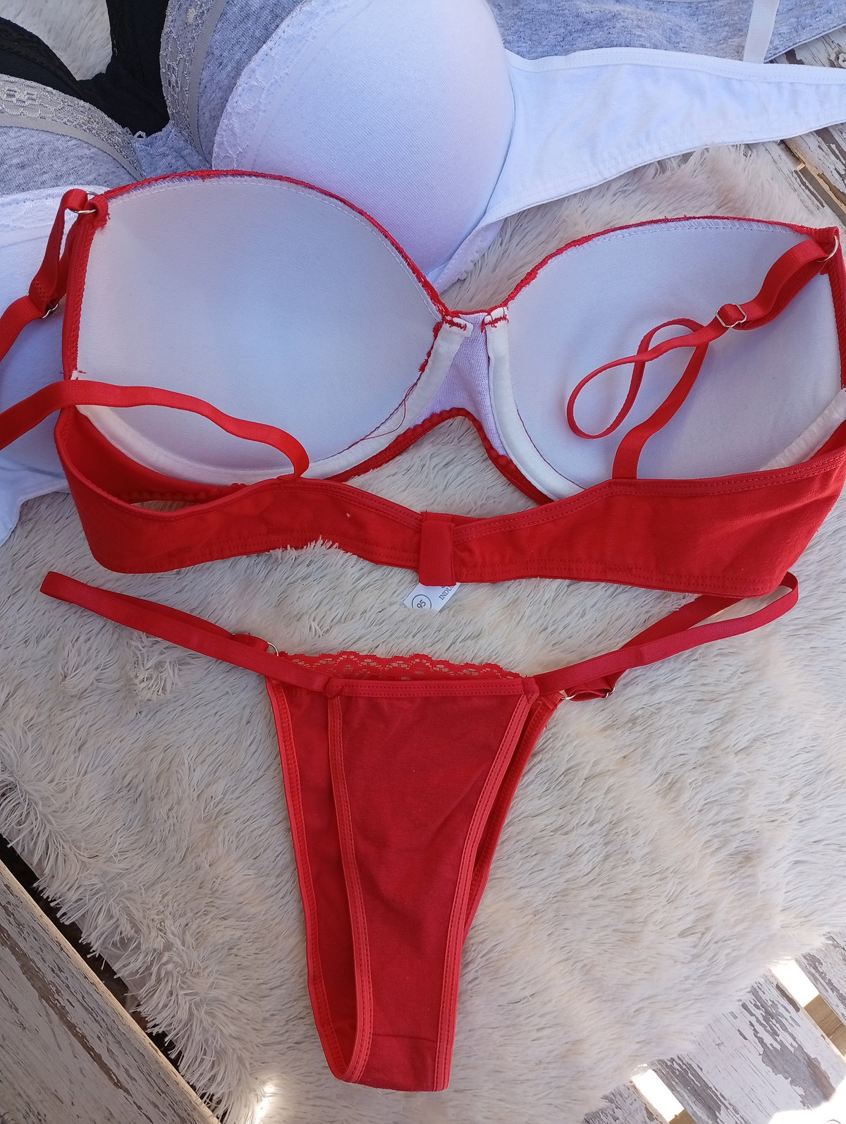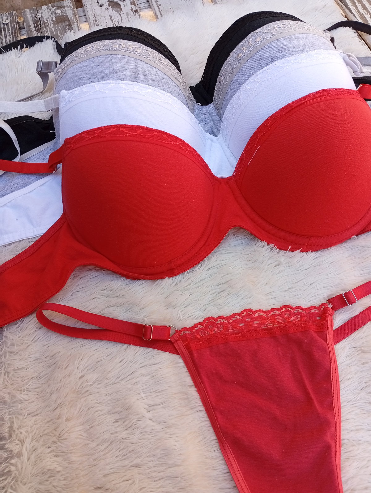 Son conjuntos armados de algodón. El corpiño tiene aro, taza soft (o push up) según la tanda del taller. Tiene detalle de puntilla en la copa y en la less, la cual es regulable.