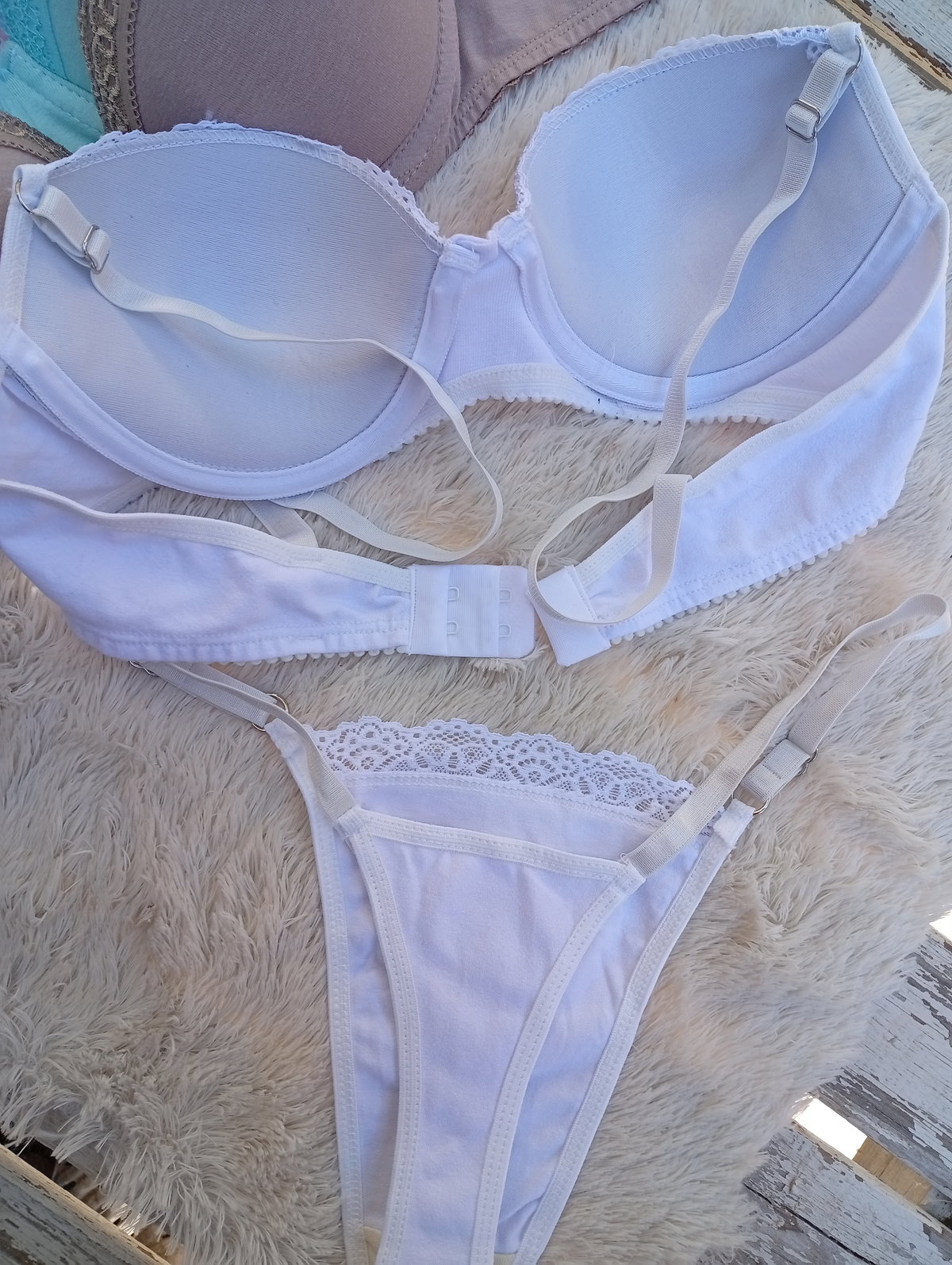 Son conjuntos armados de algodón. El corpiño tiene aro, taza soft (o push up) según la tanda del taller. Tiene detalle de puntilla en la copa y en la less, la cual es regulable.