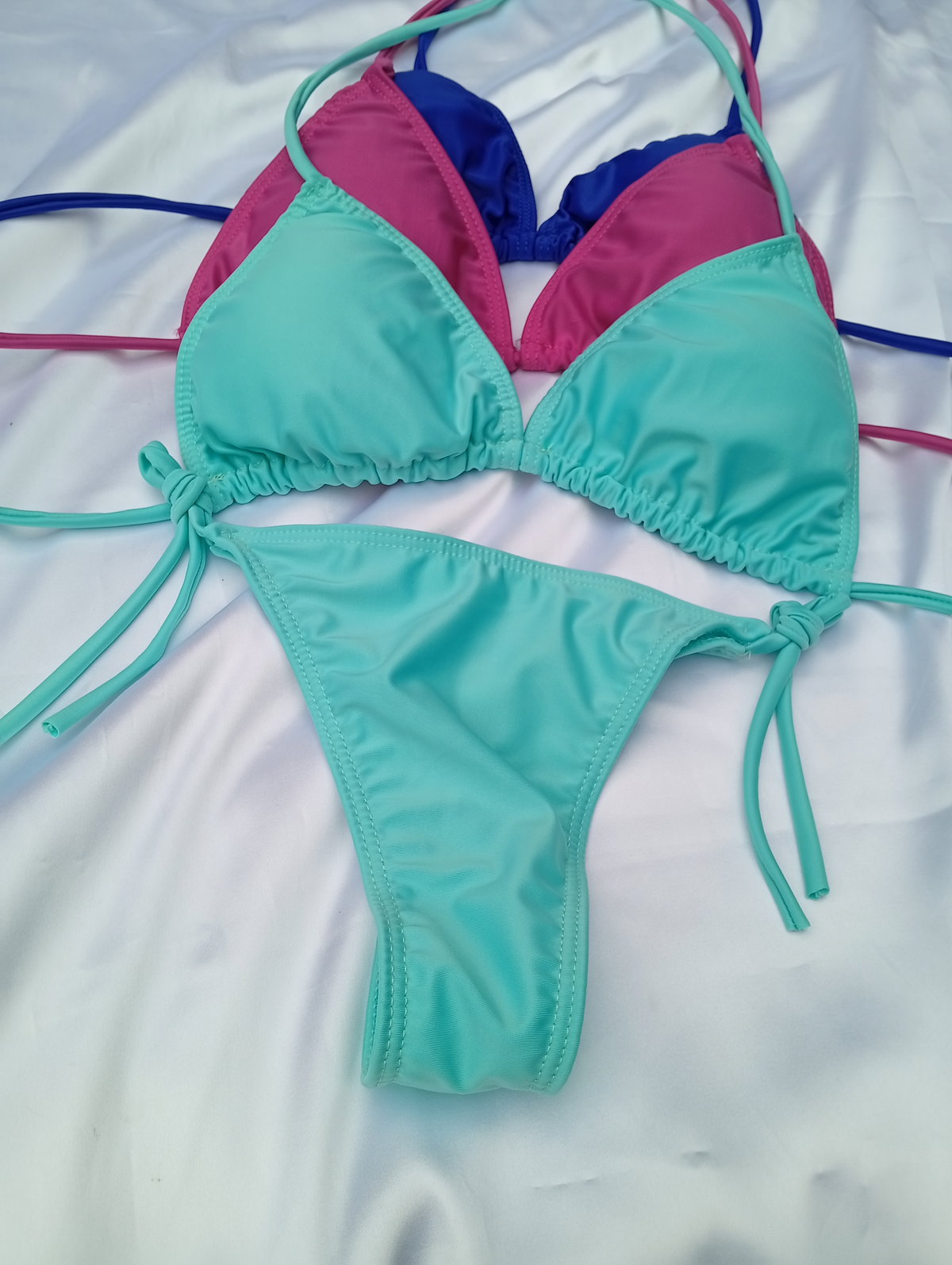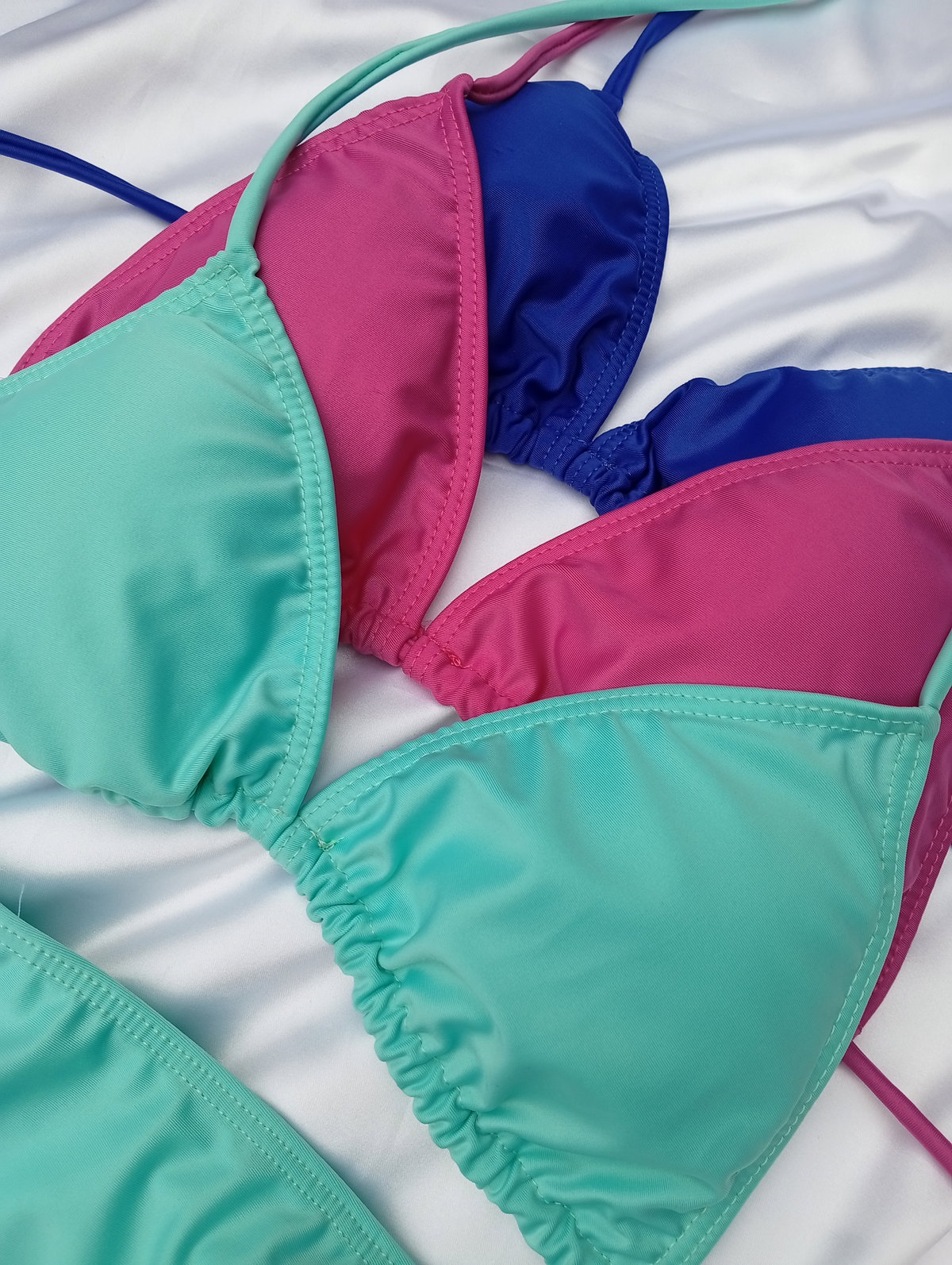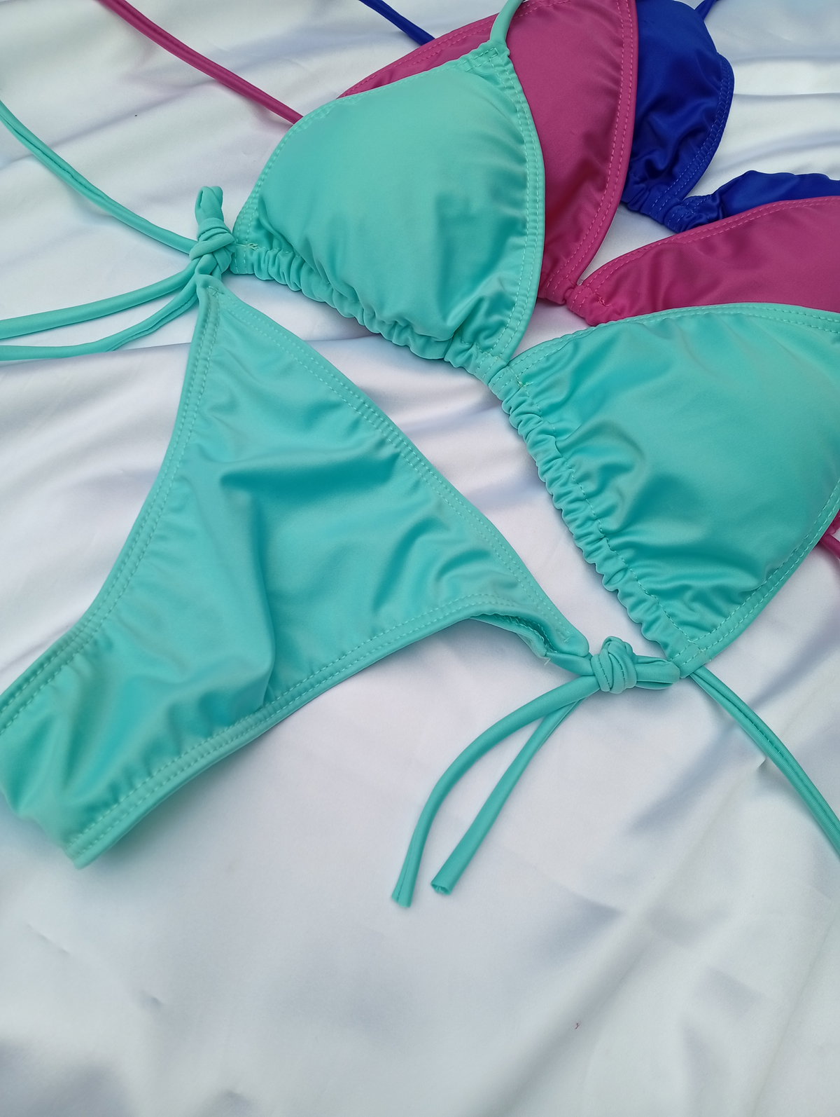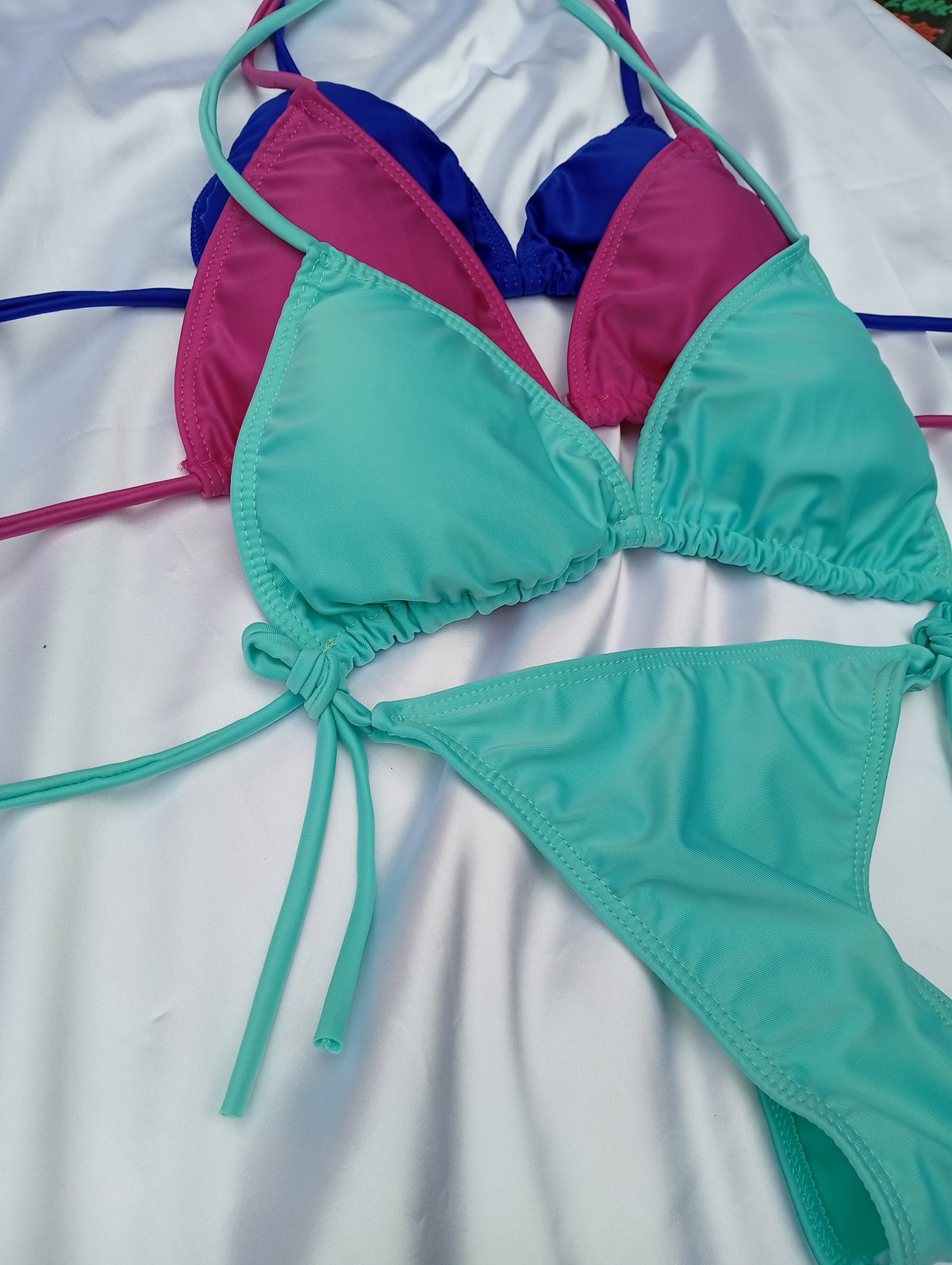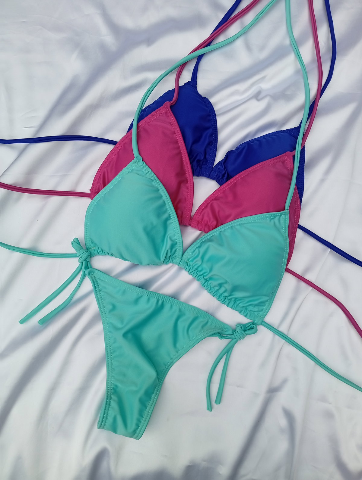 Son bikinis triangulitos con taza interna removible, tanto el corpi como la bombis (less) se atan.