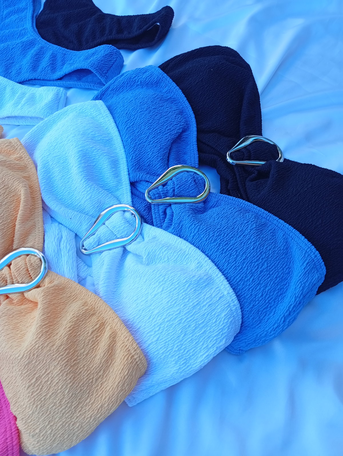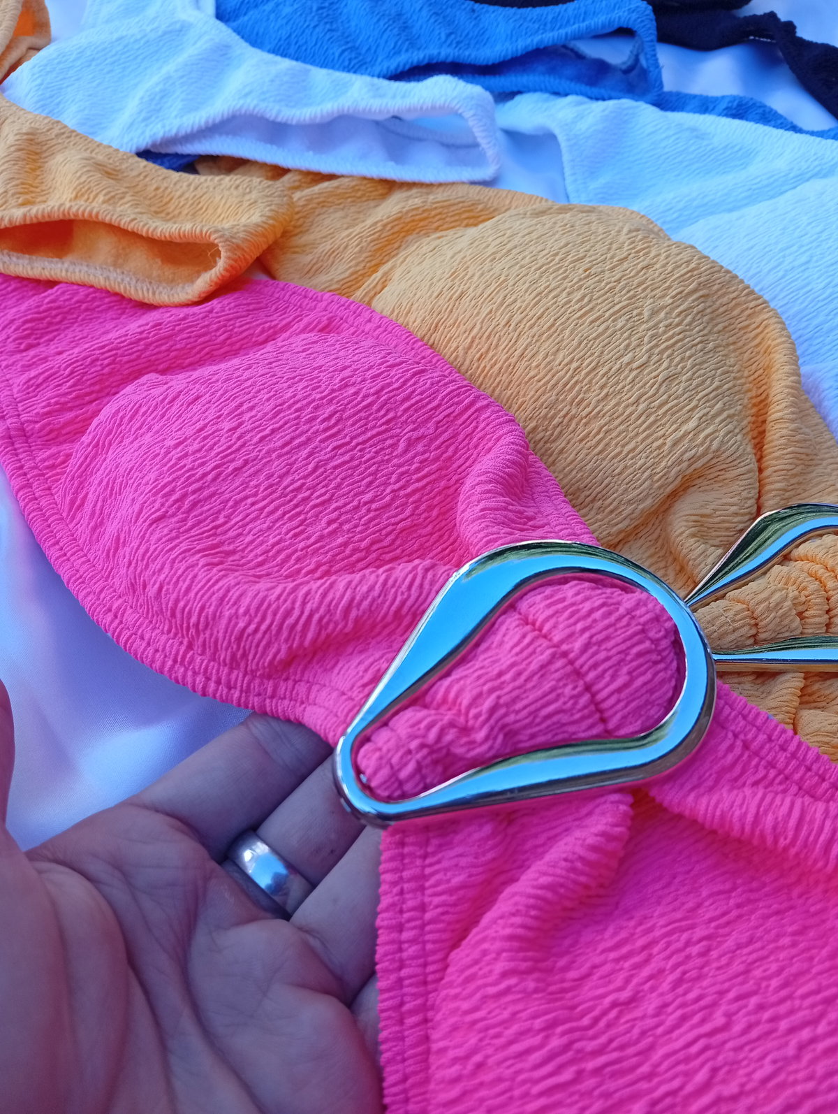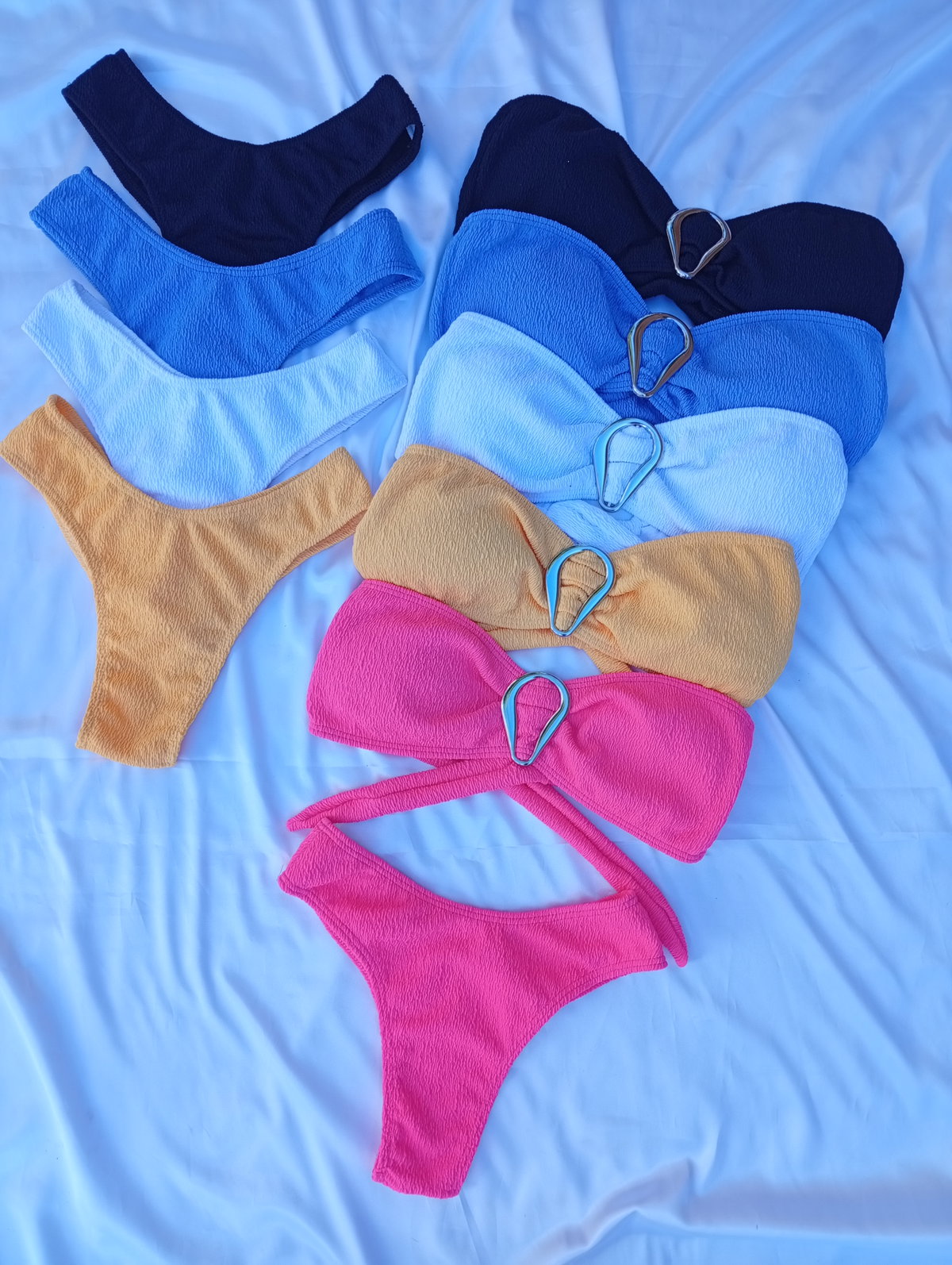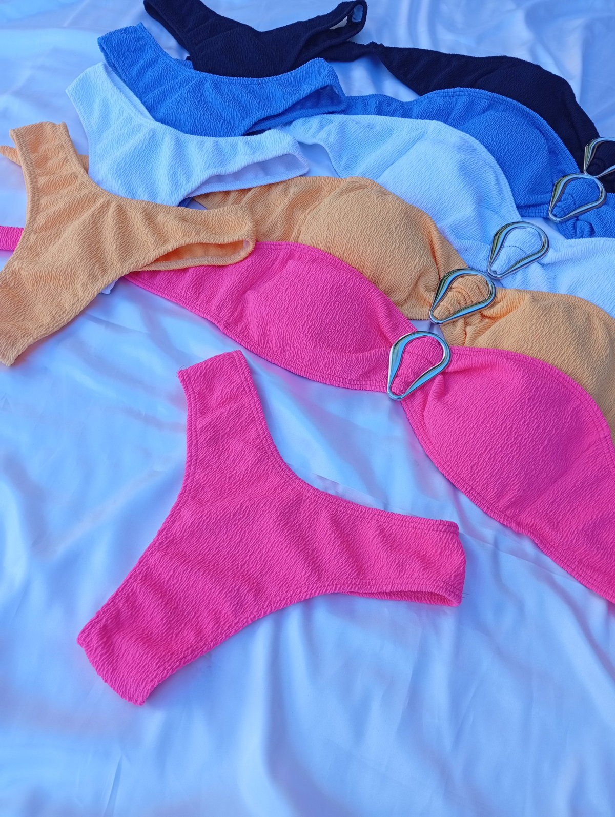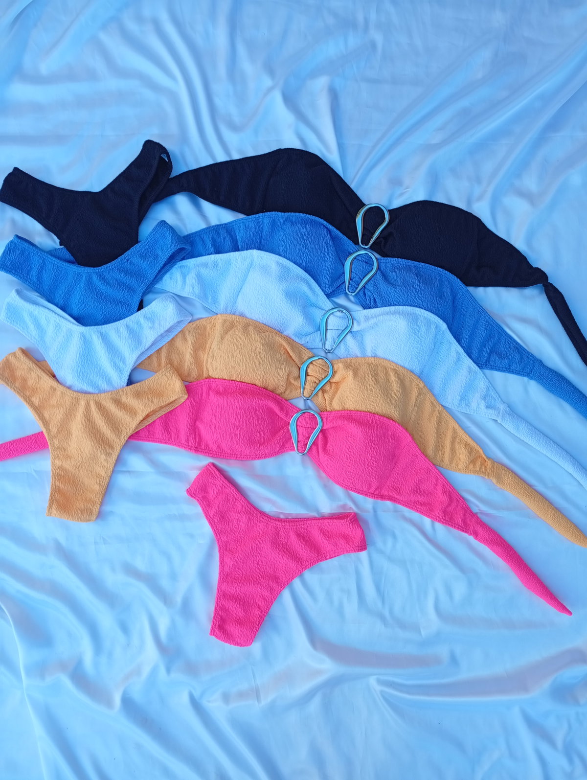 Bikinis texturadas, el corpi es tipo top tiene un avio en el centro.