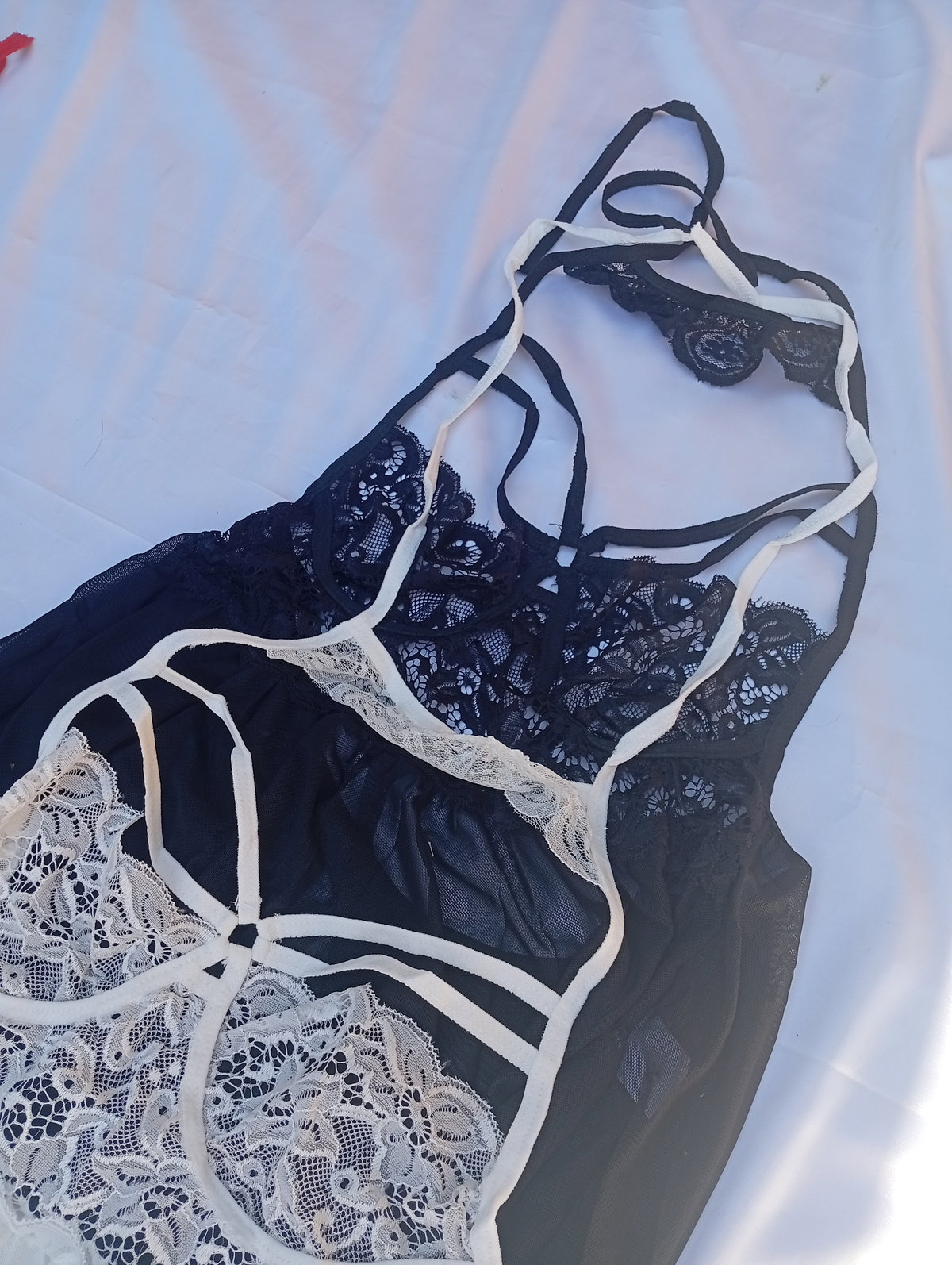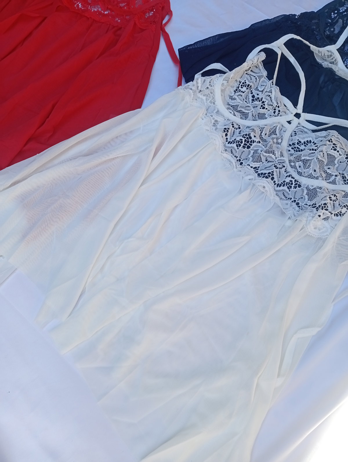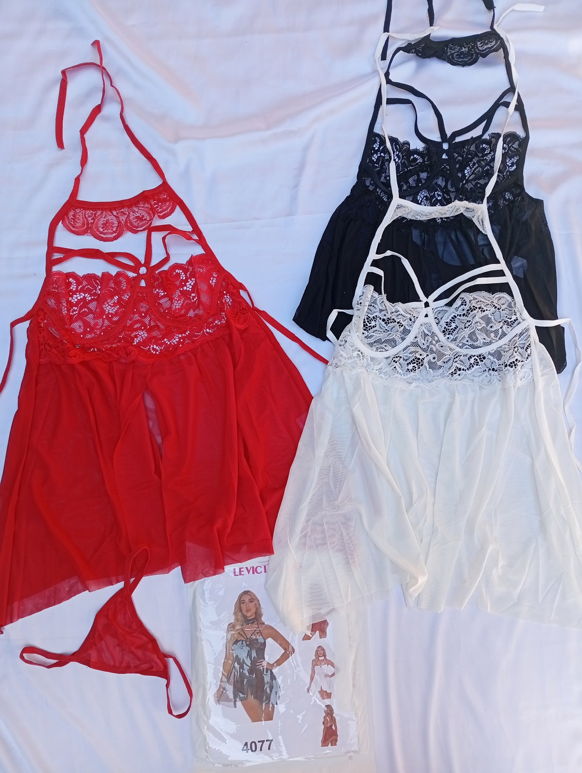 Es un babydol importado, combinación de encaje con microtul. Trae tanga de microtul.