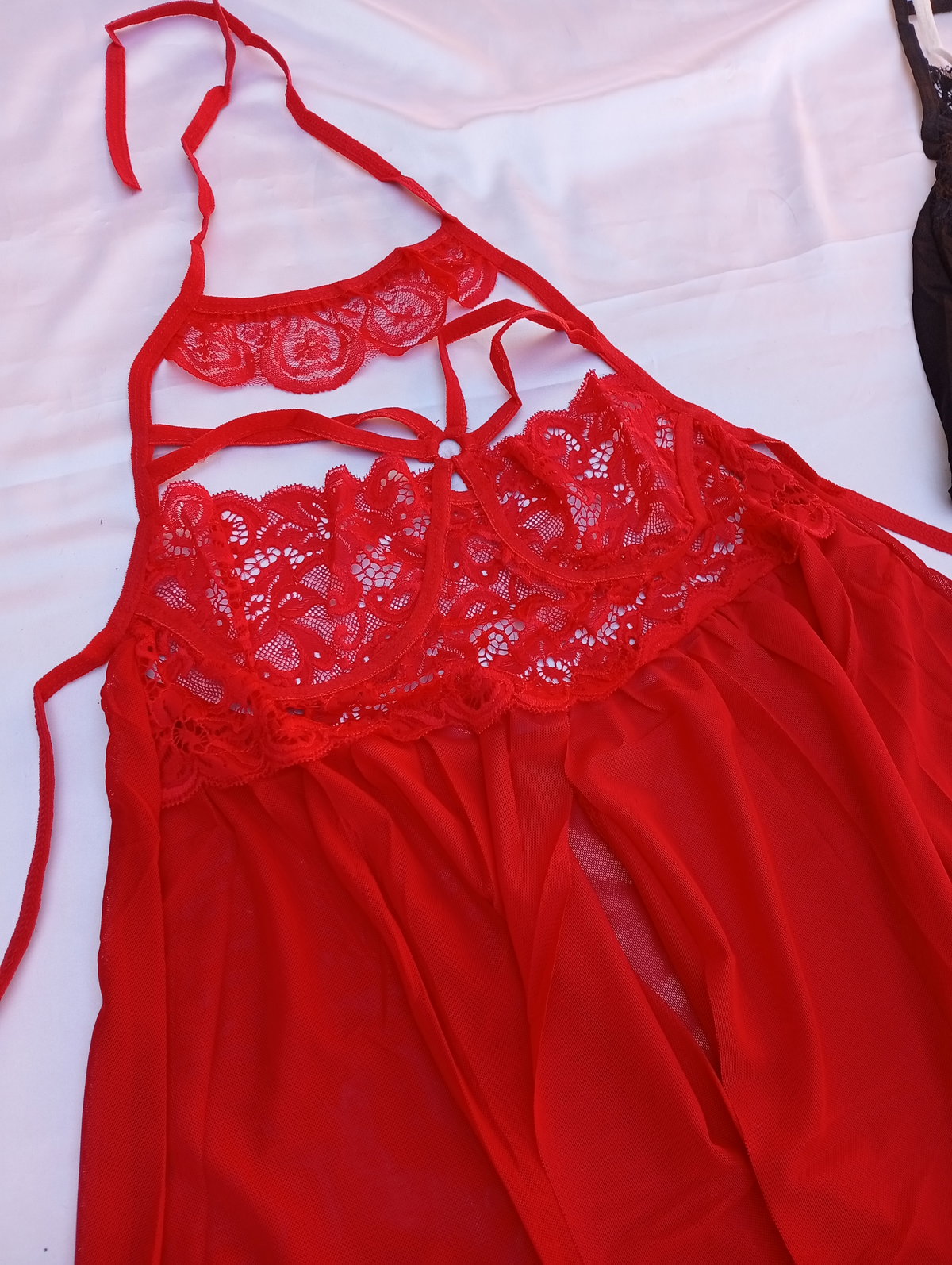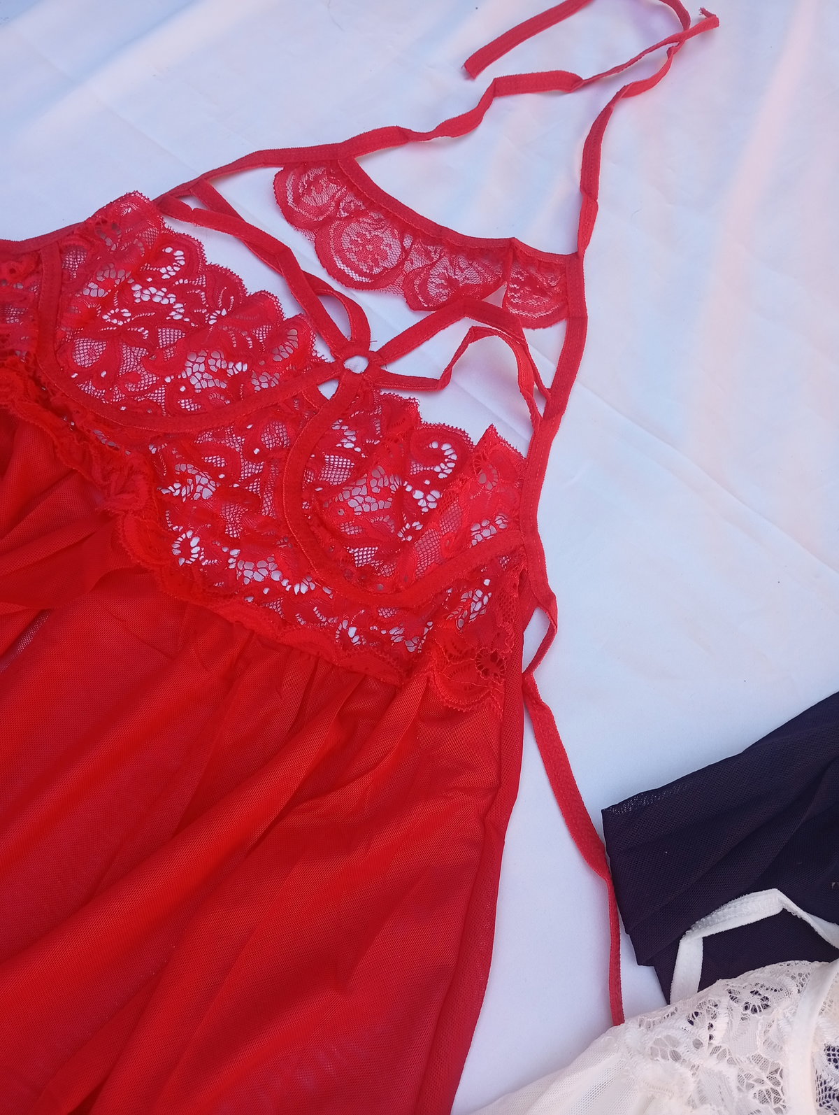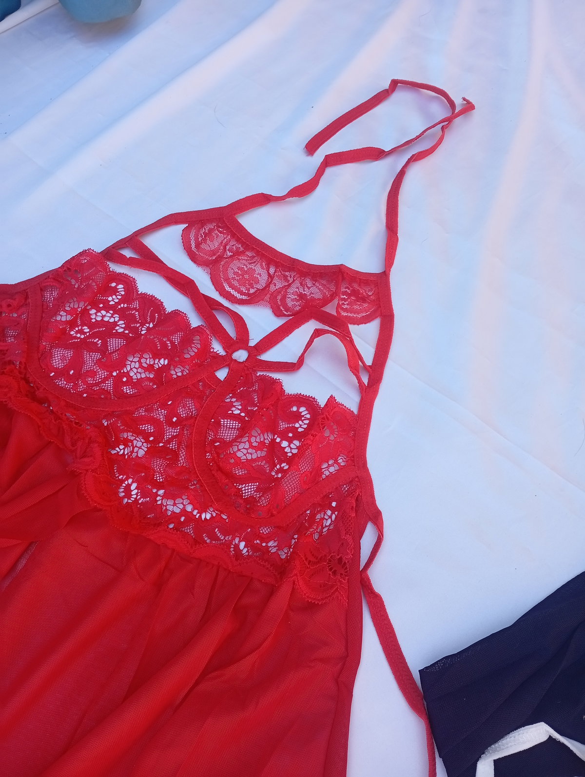 Es un babydol importado, combinación de encaje con microtul. Trae tanga de microtul.