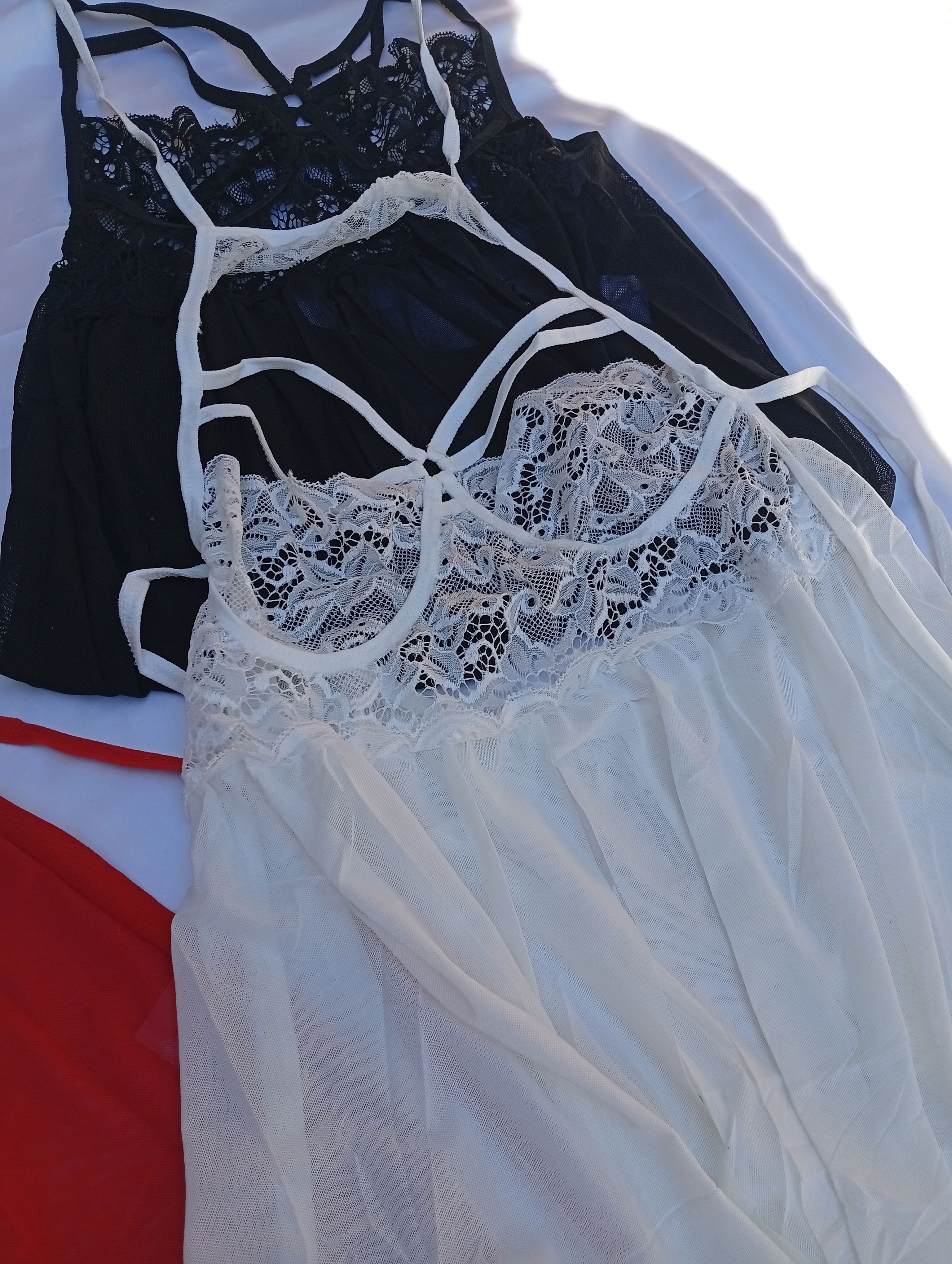 Es un babydol importado, combinación de encaje con microtul. Trae tanga de microtul.