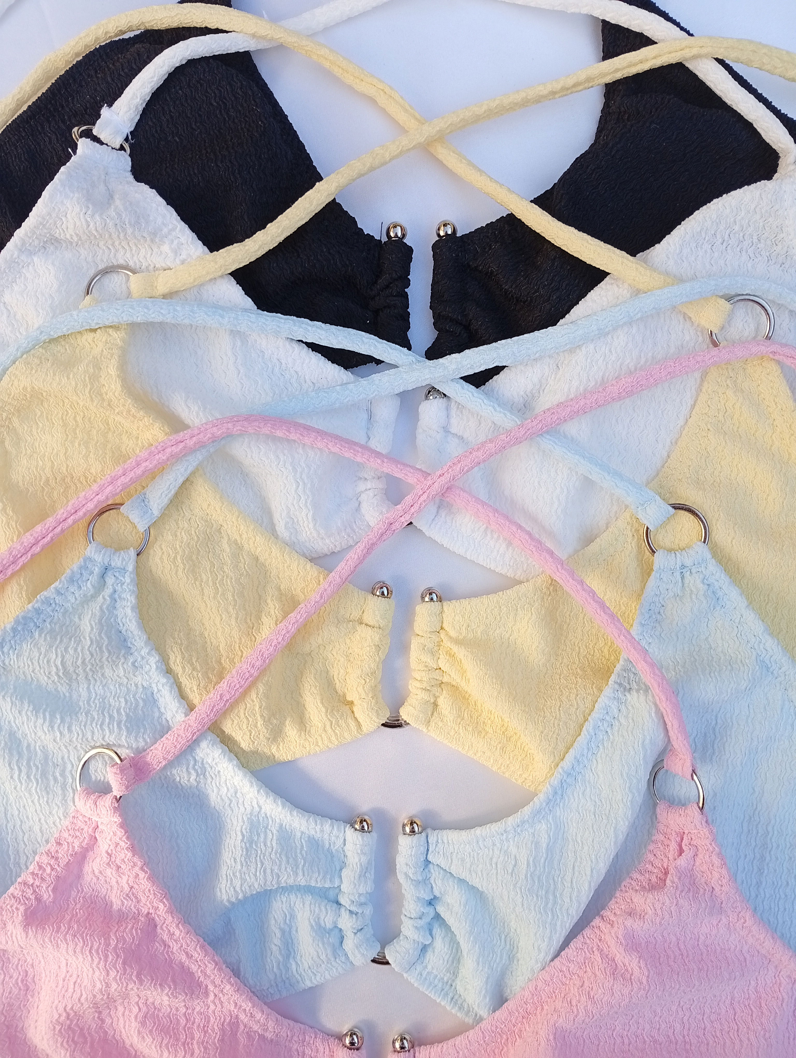 Bikini triangulito confeccionada en tela Bambula, también es texturada. Tiene argolla en U en el corpi. Tiene taza removible.