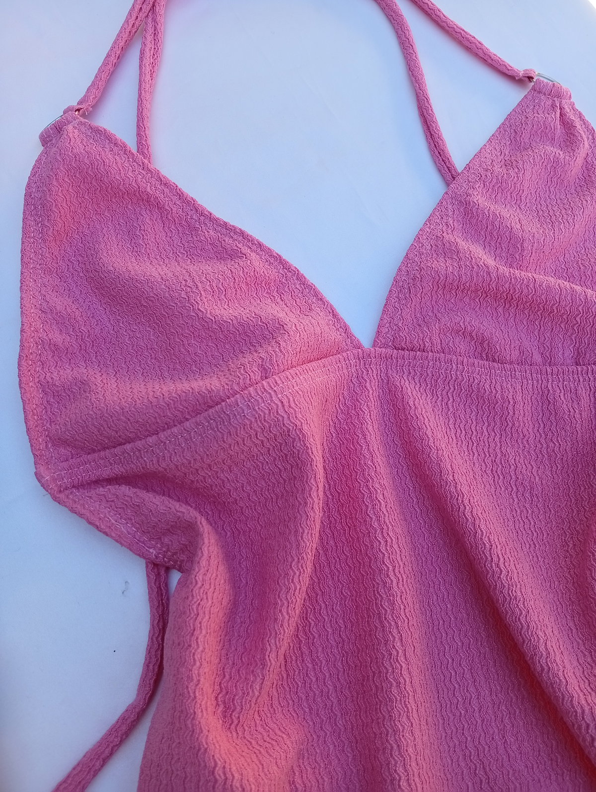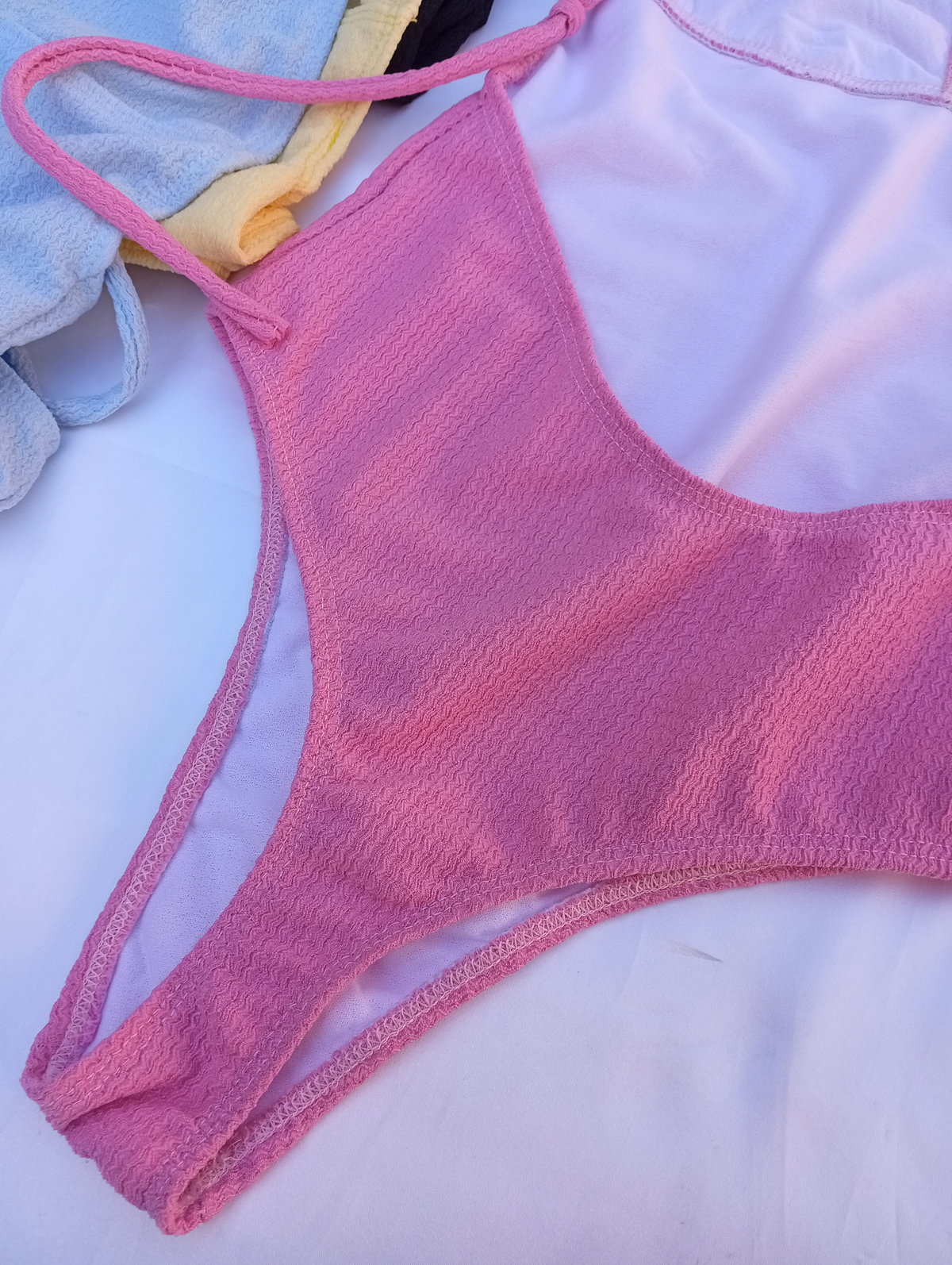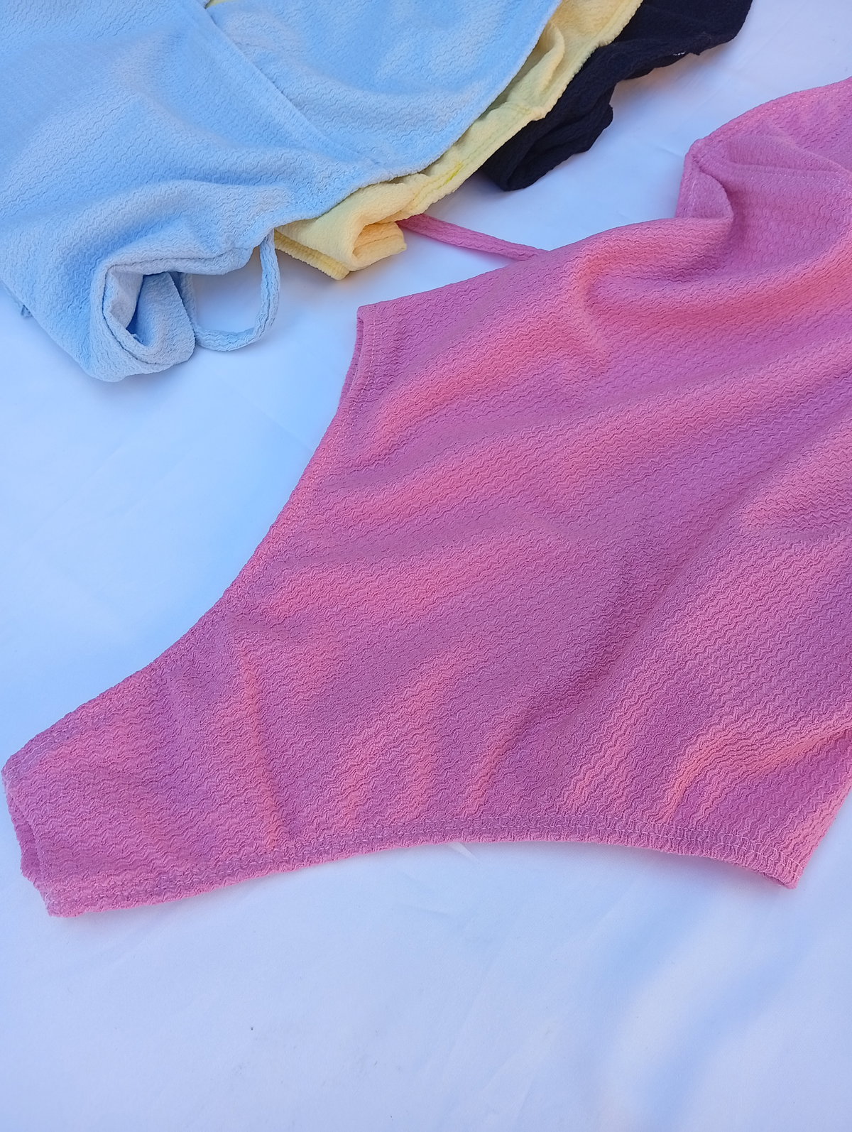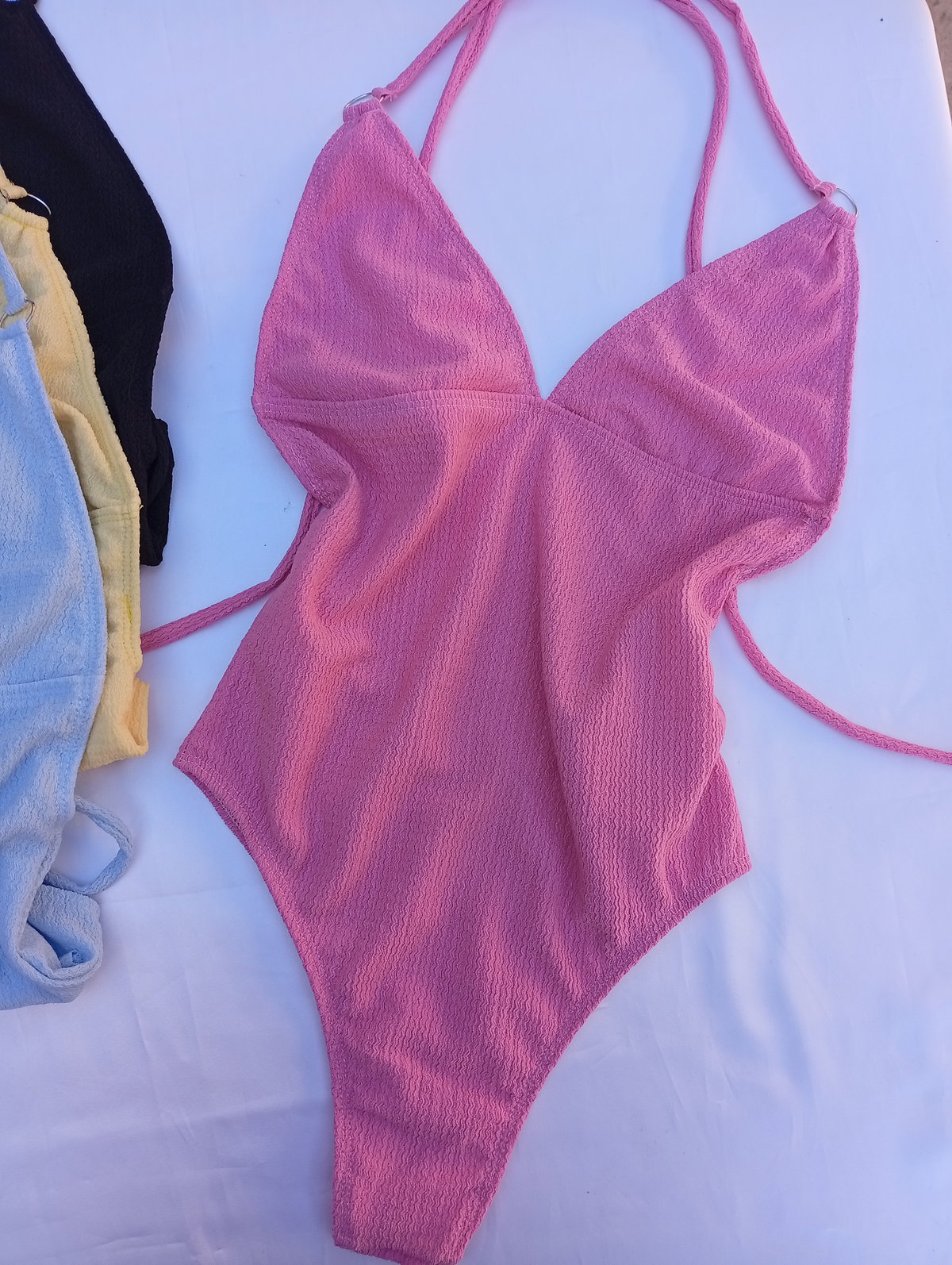 Malla enteriza confeccionada en tela Bruselas, texturada suave.