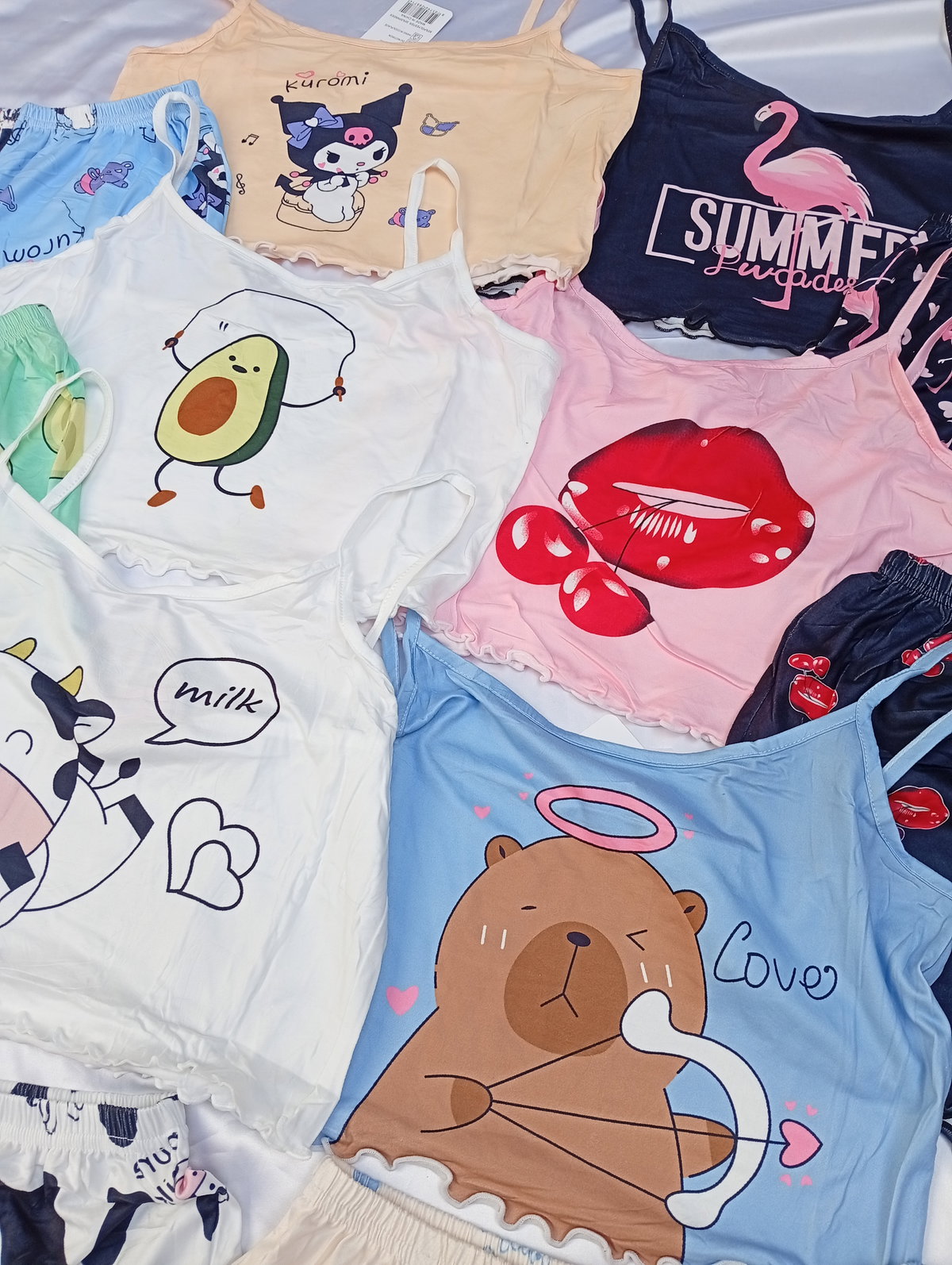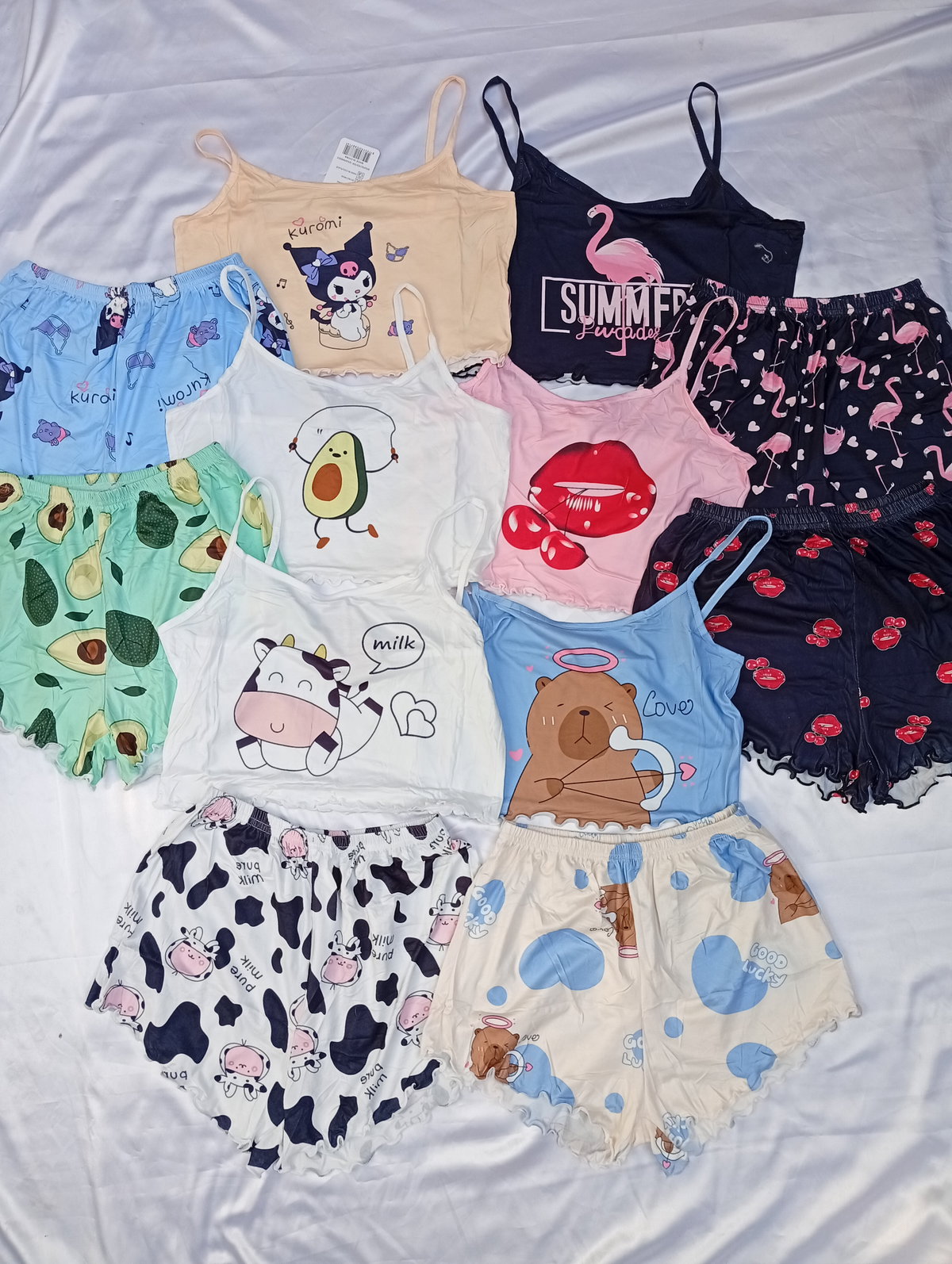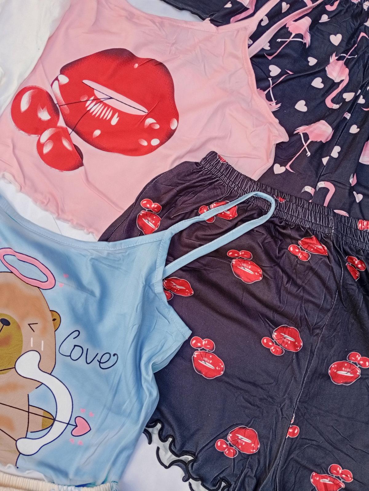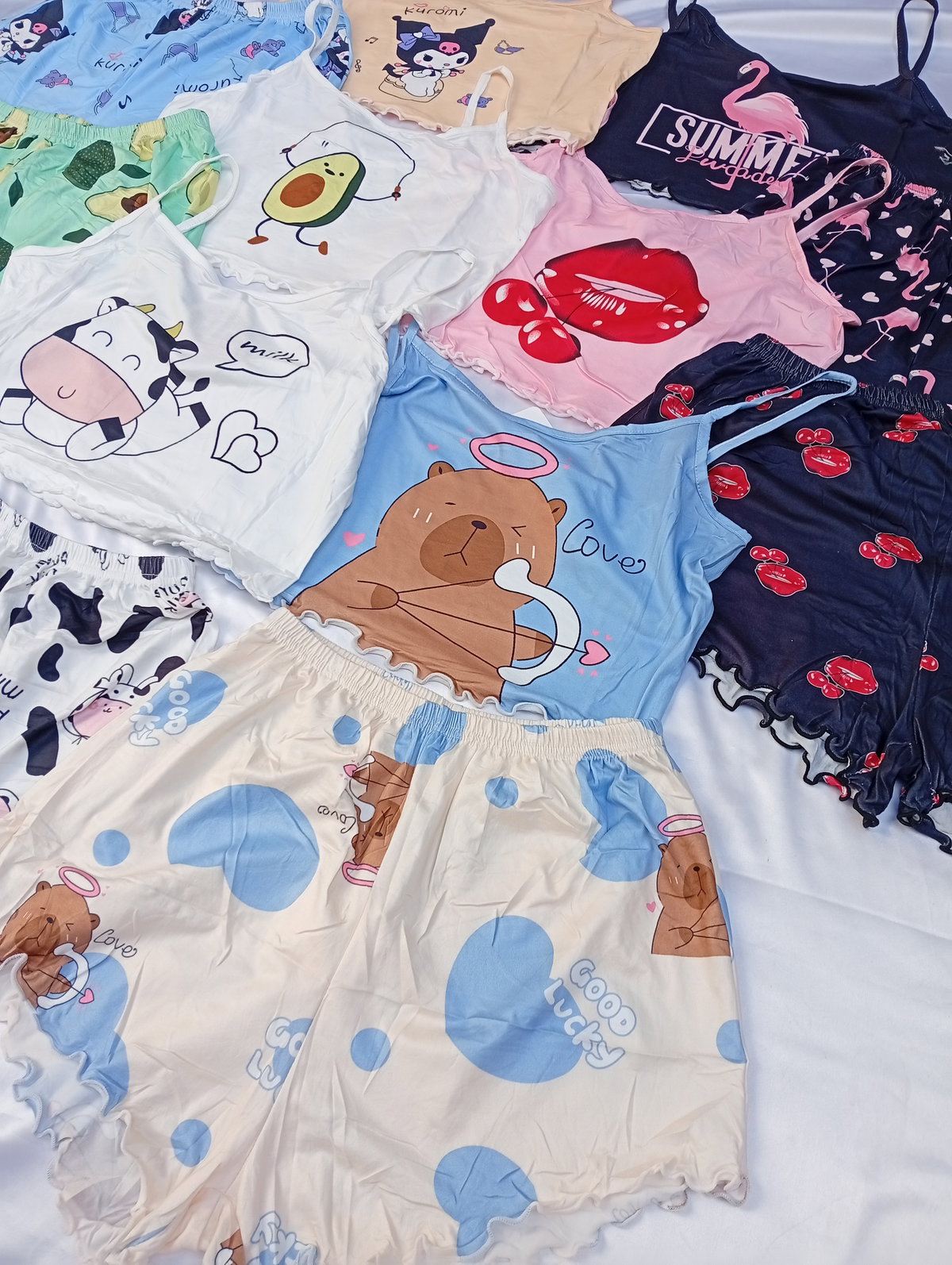 Son pijamas importadas de dos piezas, la remerita es tipo top, y el shor es tiro alto. Super suaves y fresquitos ideal para la temporada.