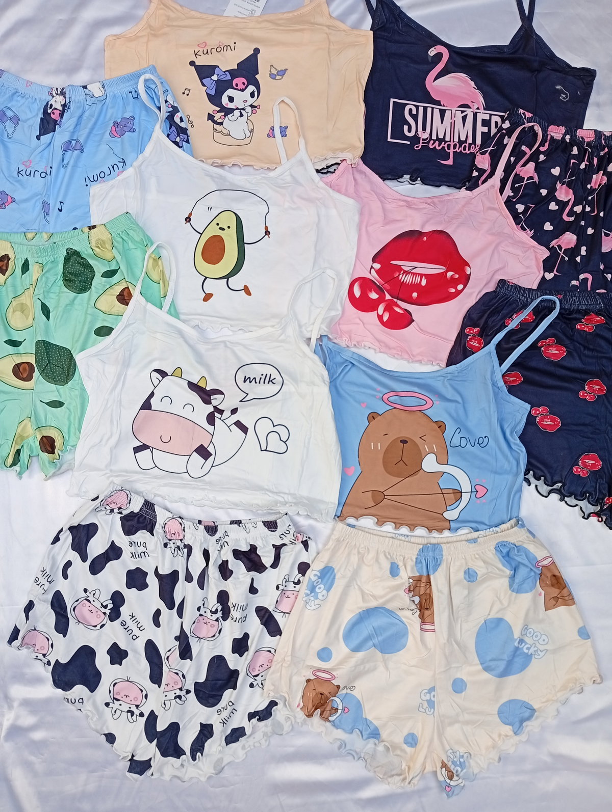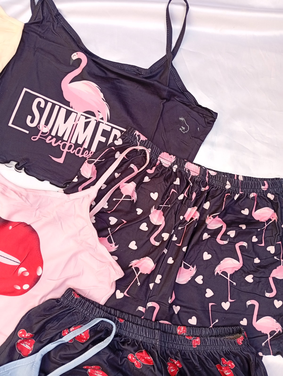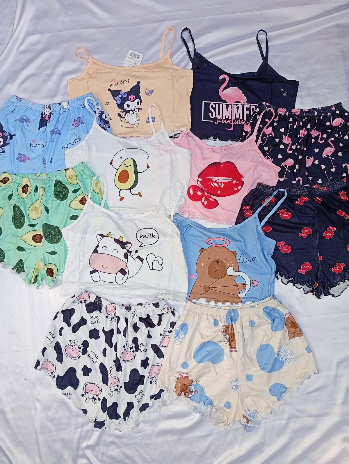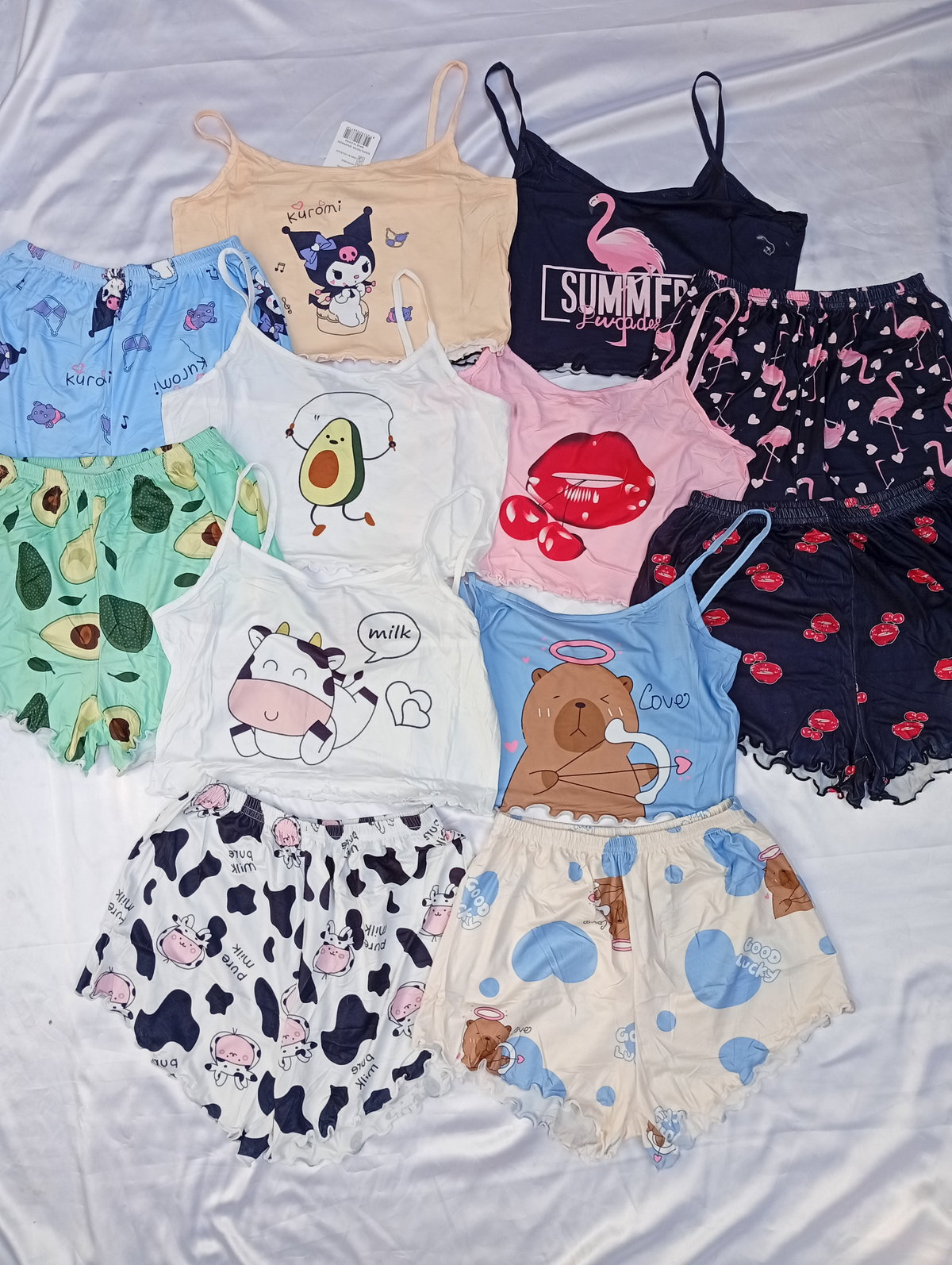 Son pijamas importadas de dos piezas, la remerita es tipo top, y el shor es tiro alto. Super suaves y fresquitos ideal para la temporada.