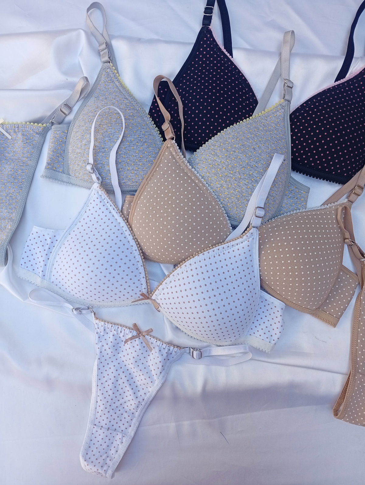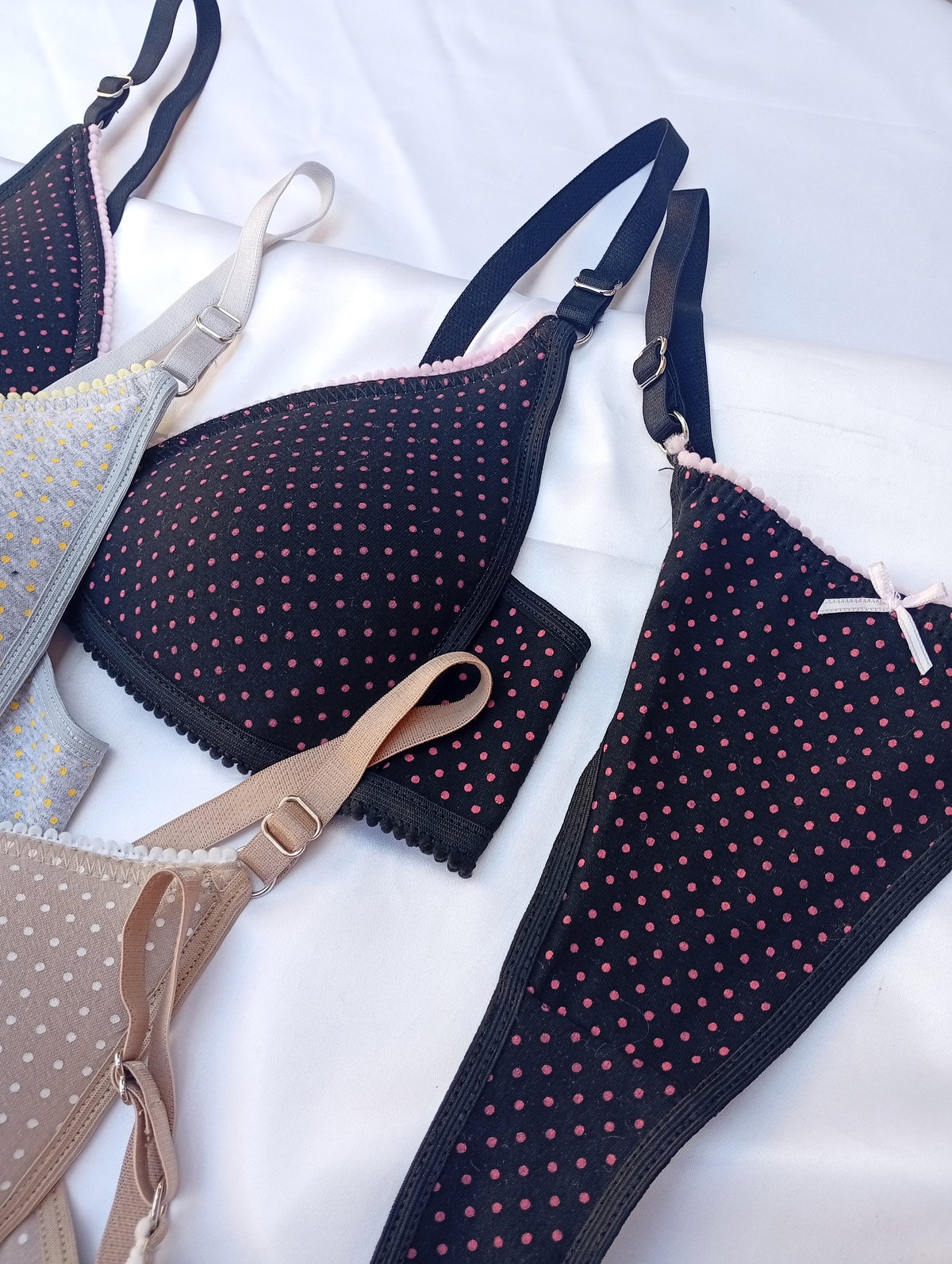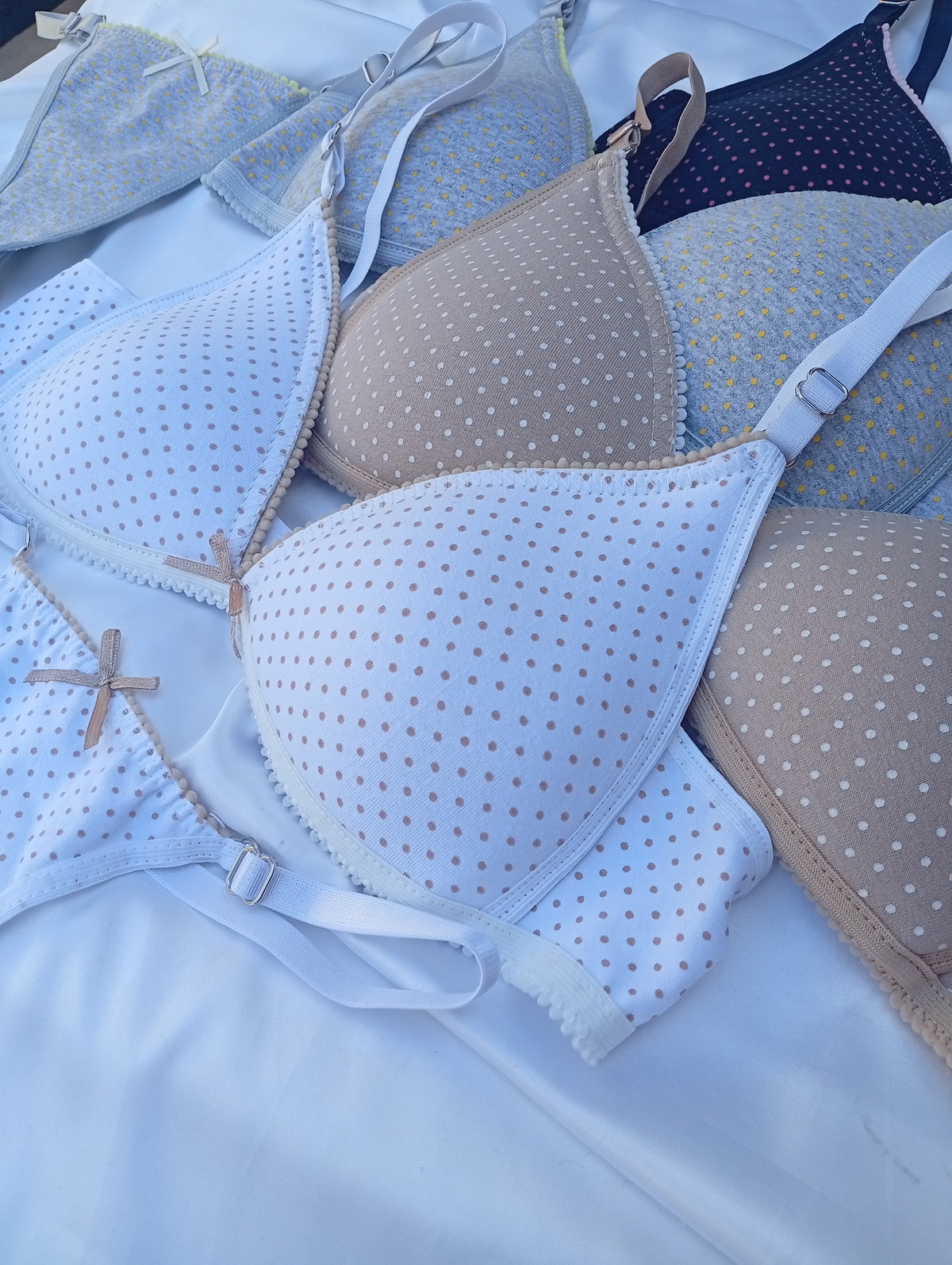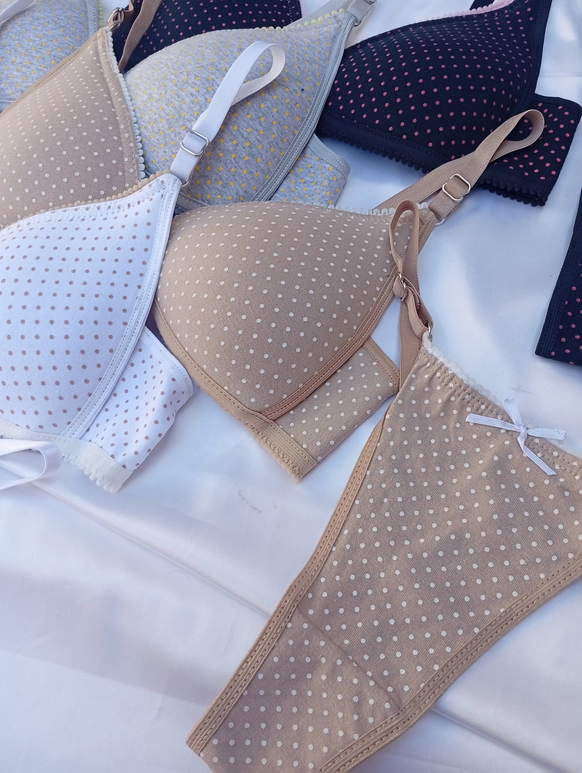 Conjunto Triangulito de algodón estampado lunares, tienen moñito tanto corpi como less.
