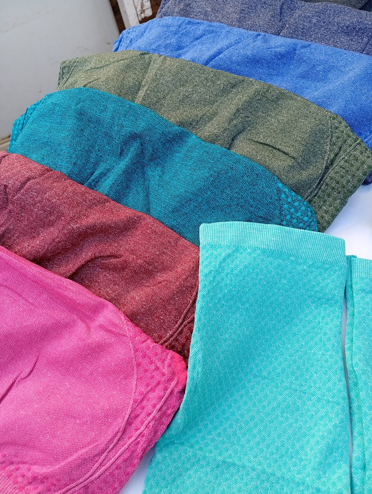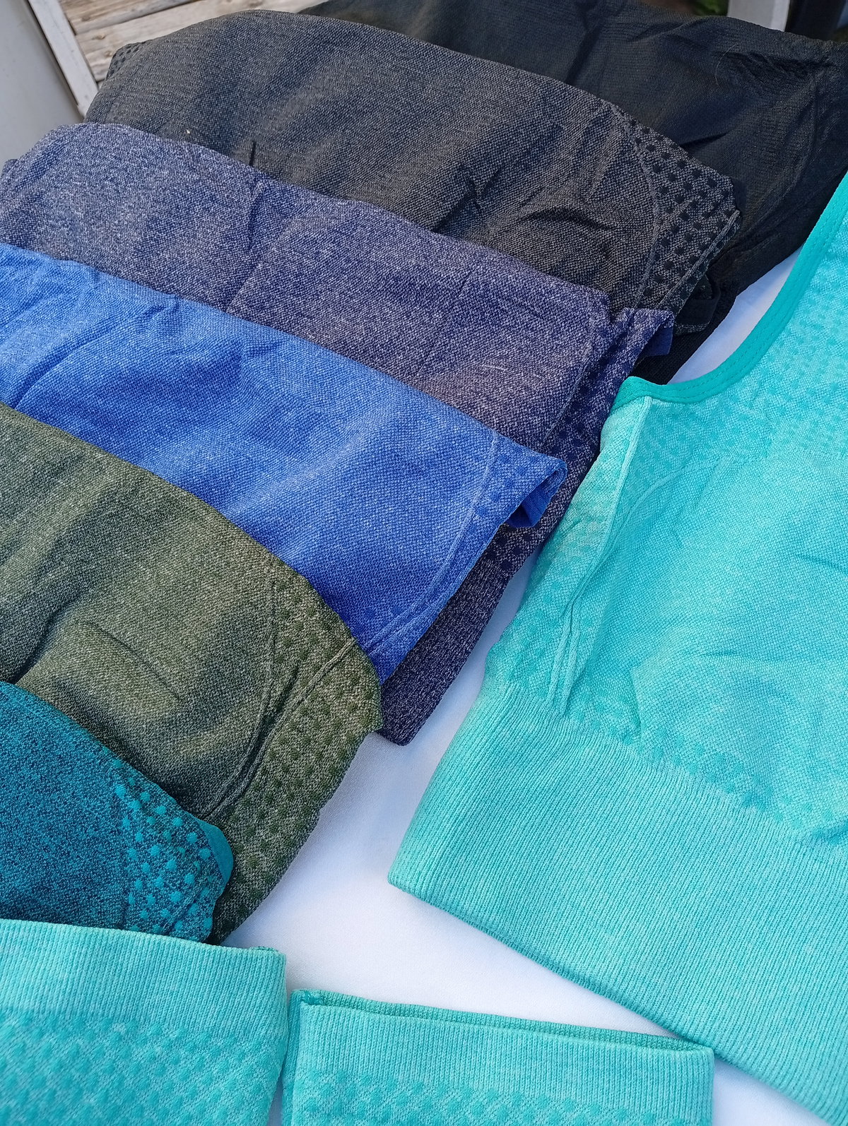 El top es sin armar, sin almohadillas. La calza es larga, con faja alta, y frunce en la cola (efecto push up).