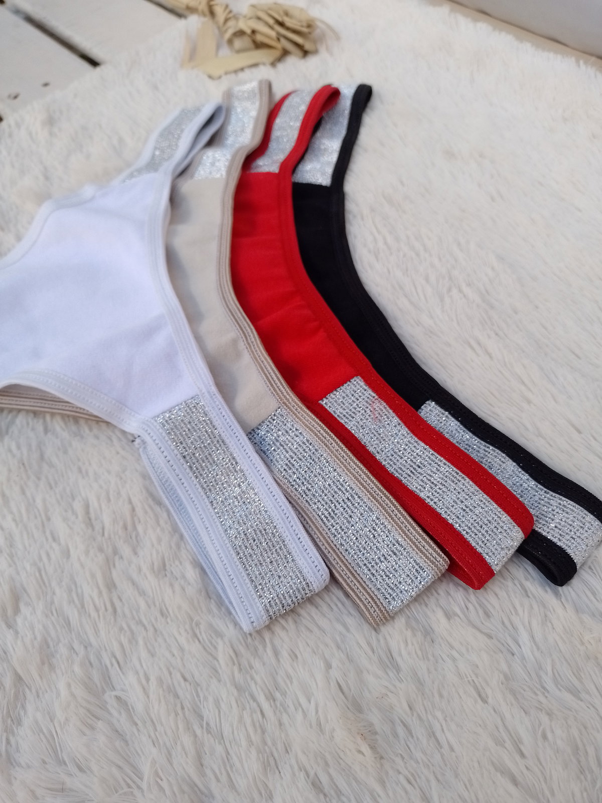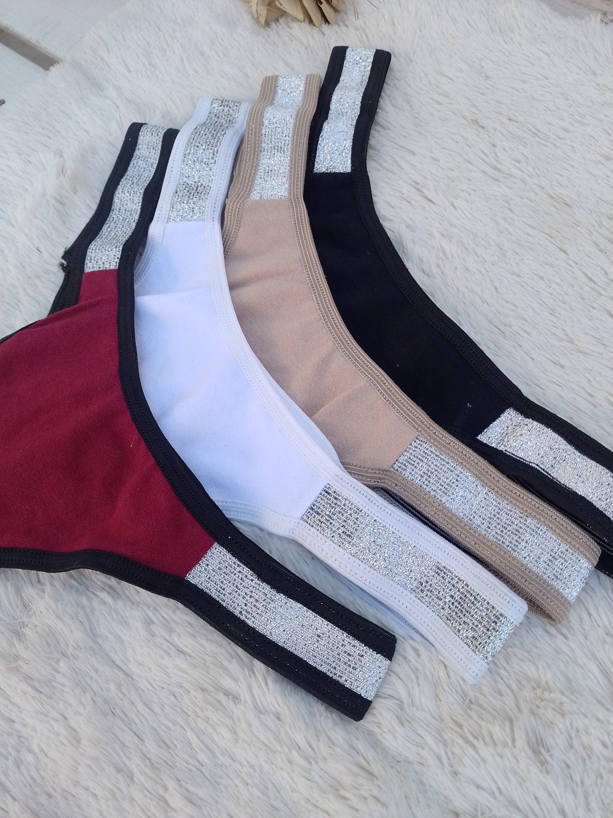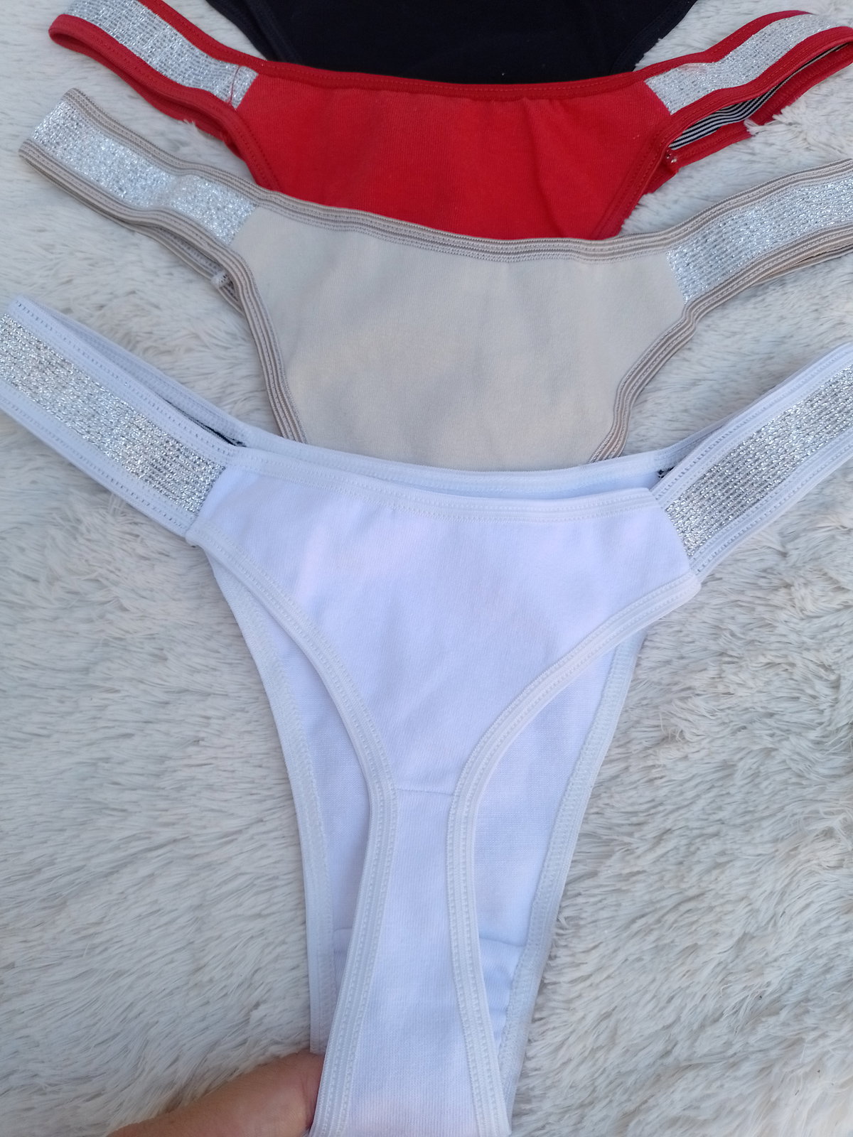 Son colales enteras la tela es algodón con lycra suavecita elástica y respirable. El elástico es lurex de 2 cm de ancho. Va de un talle 38 a un 42. El tiro es alto en forma de V