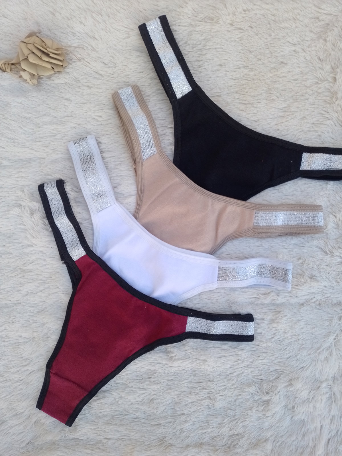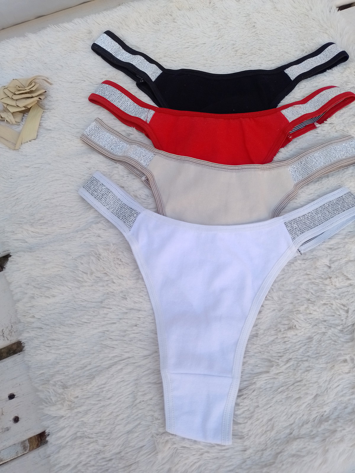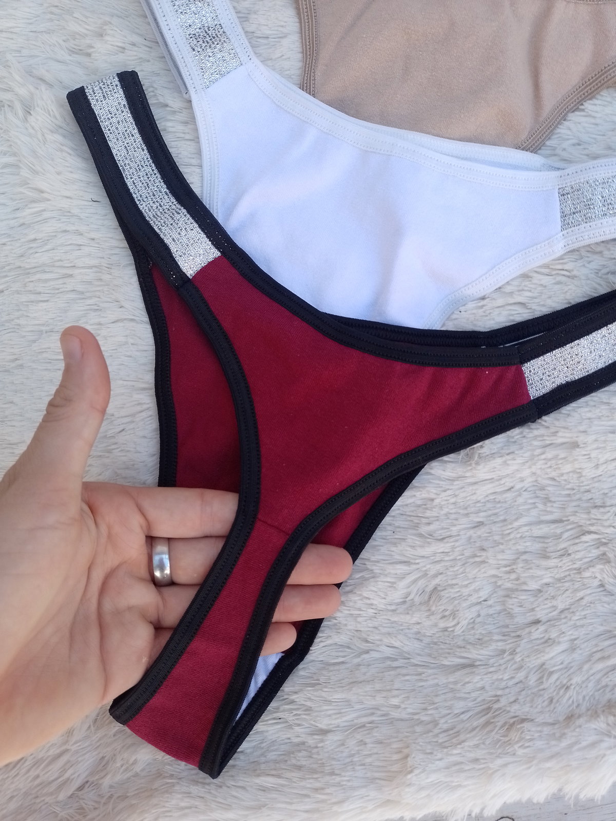 Son colales enteras la tela es algodón con lycra suavecita elástica y respirable. El elástico es lurex de 2 cm de ancho. Va de un talle 38 a un 42. El tiro es alto en forma de V