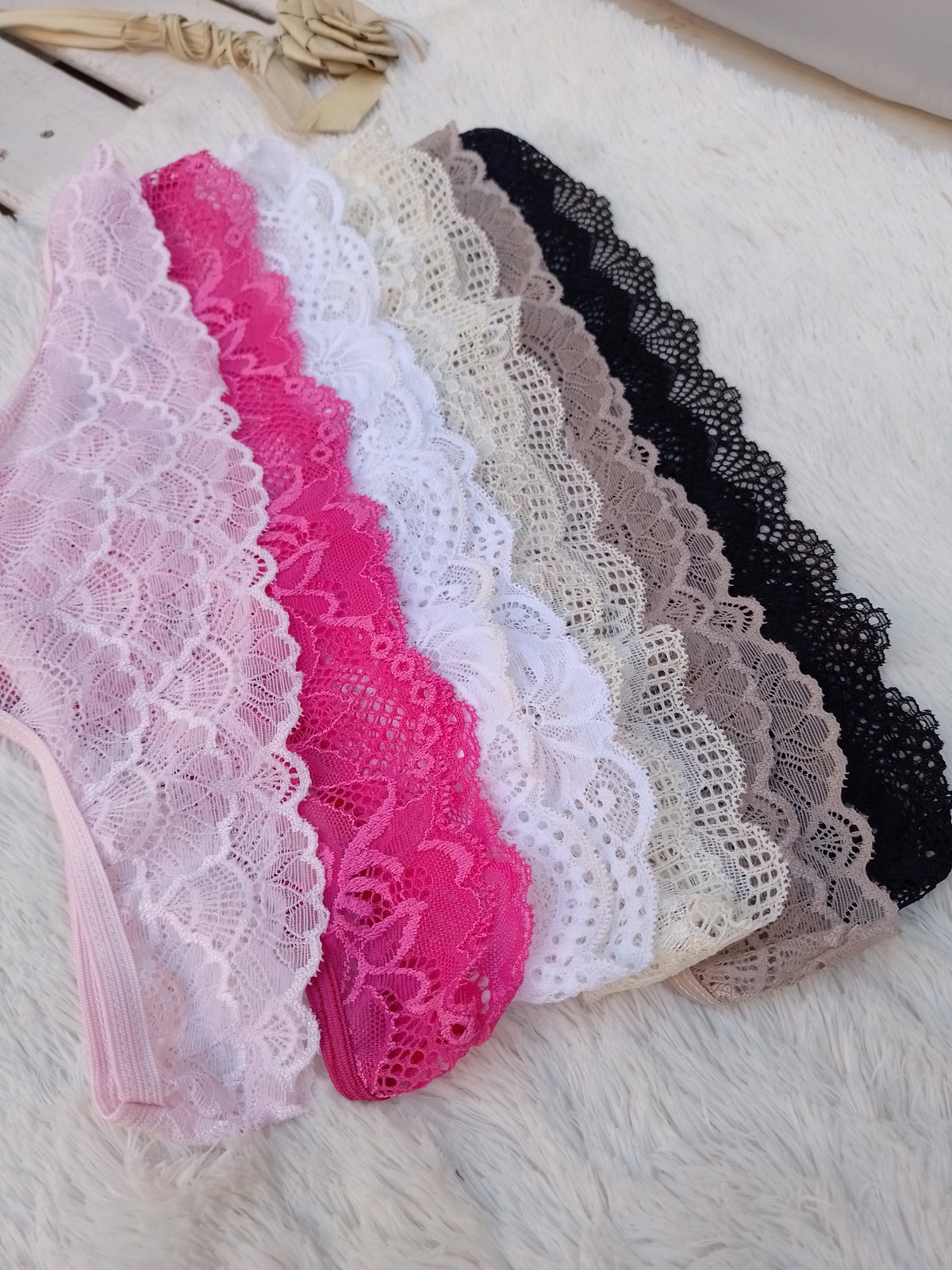 El diseño del encaje suele variar segun la tanda del taller, por lo general se repeta el mismo diseño (flores, algunos vienen con corazones, abanicos, etc) los colores sí se respetan.