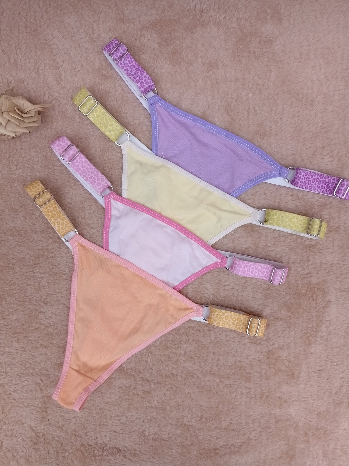 Son colales de algodon, regulables de elastico ancho, los colores son pastel, varian segun la tanda del taller, pueden tener o no moñitos. Son talles unicos abarca del 36 al 40
