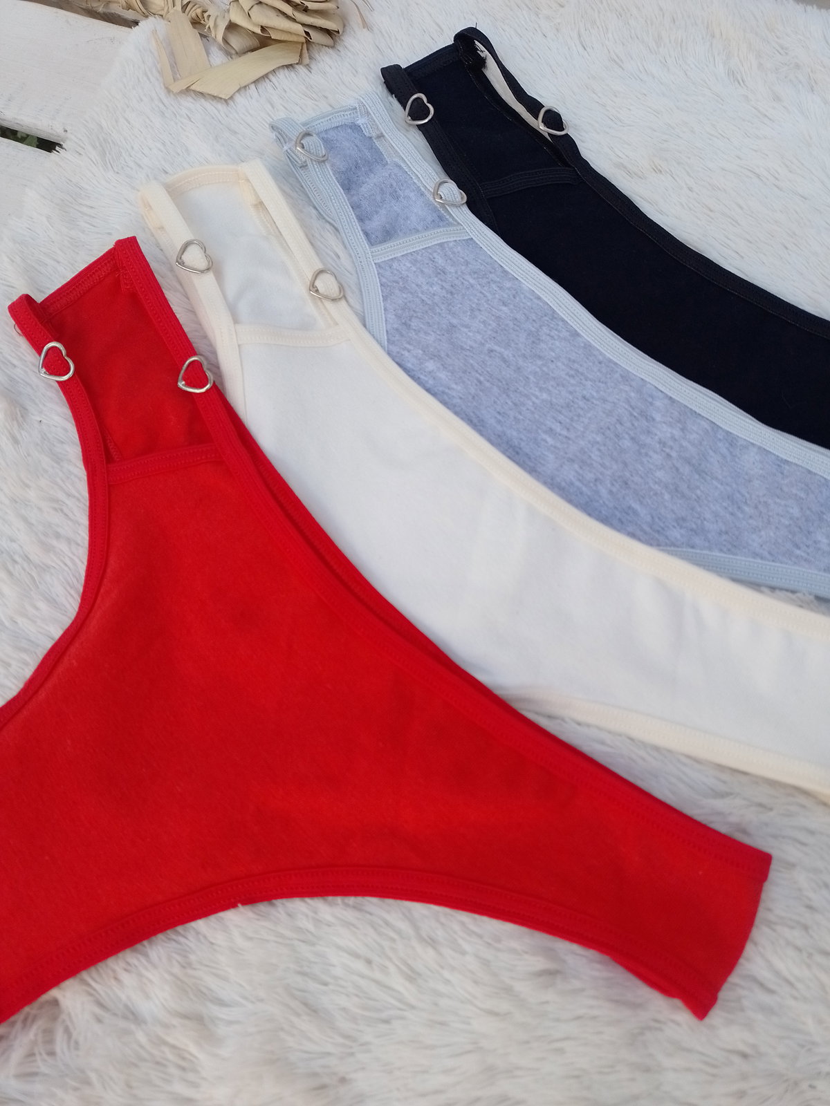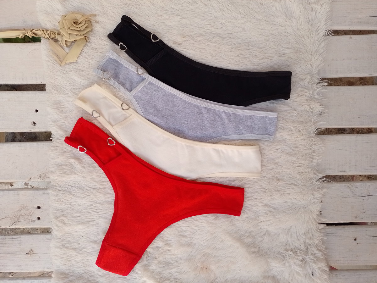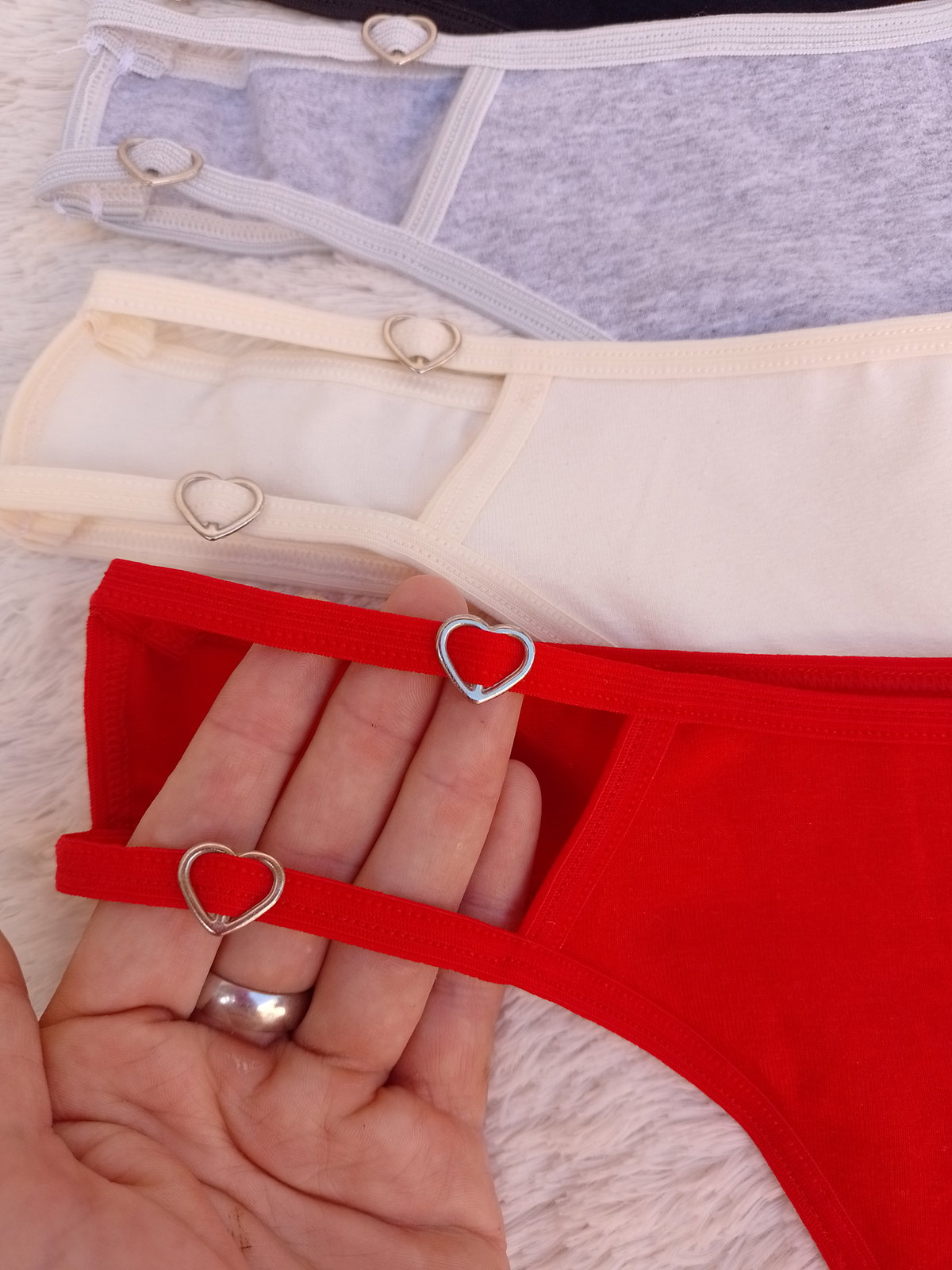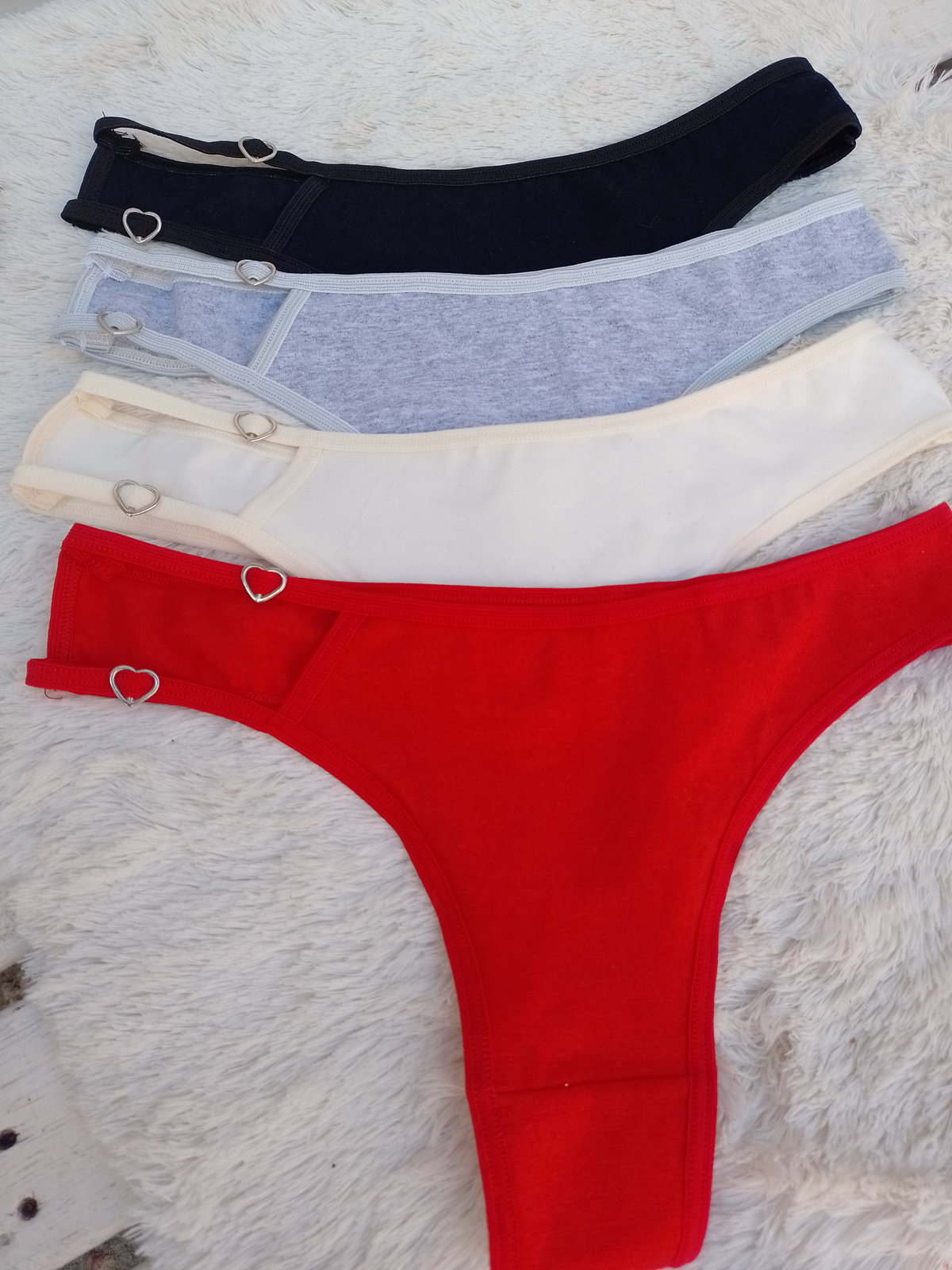 Son colales de algodon enteras, tienen 2 tiras en el lateral con el dije de corazon. Son talles unicos abarca del 36 al 42