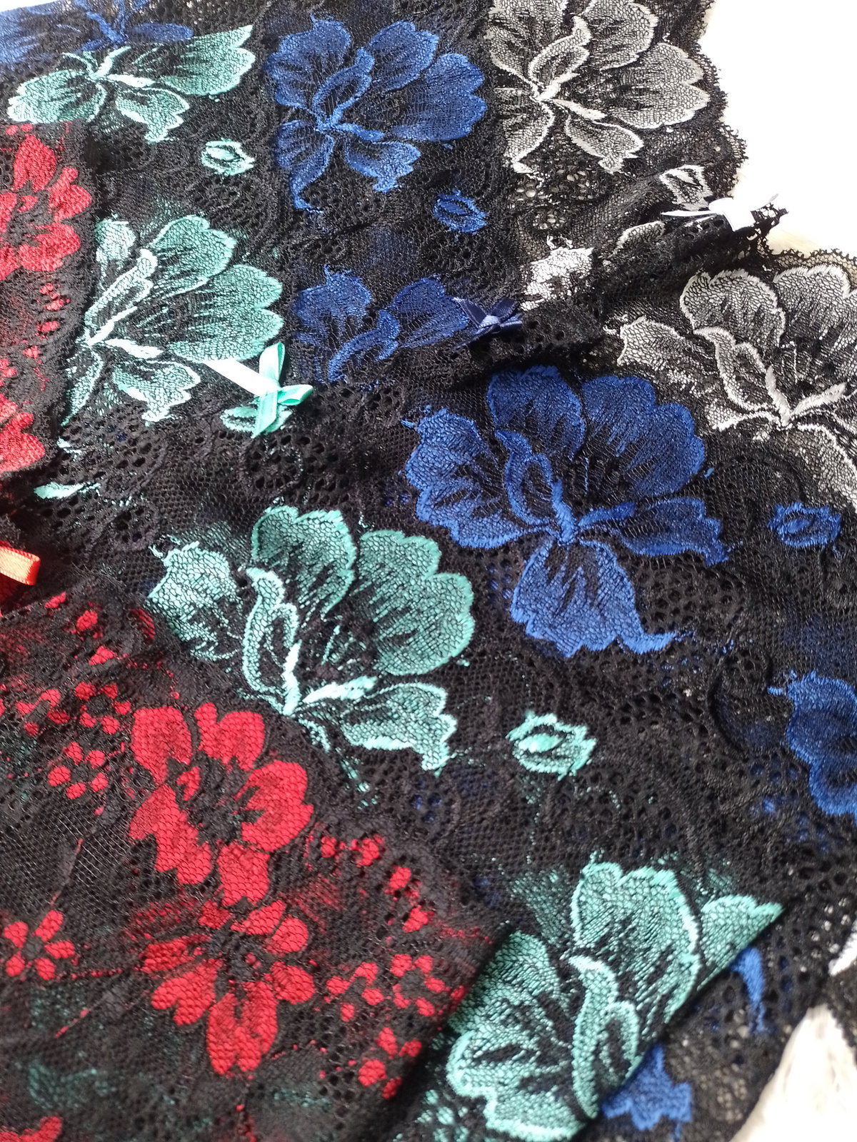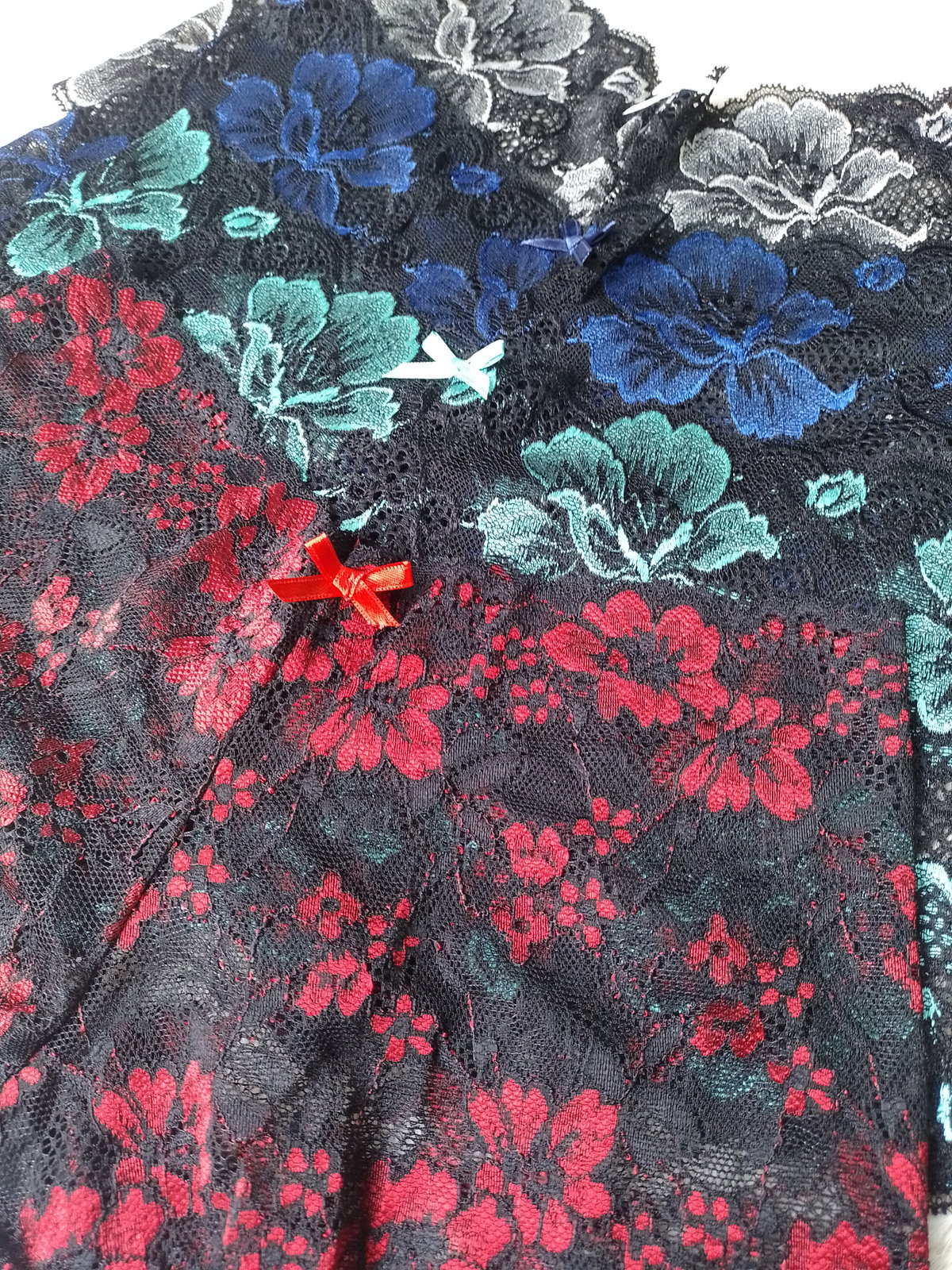 Son todo encaje, la tela es bicolor con negro.