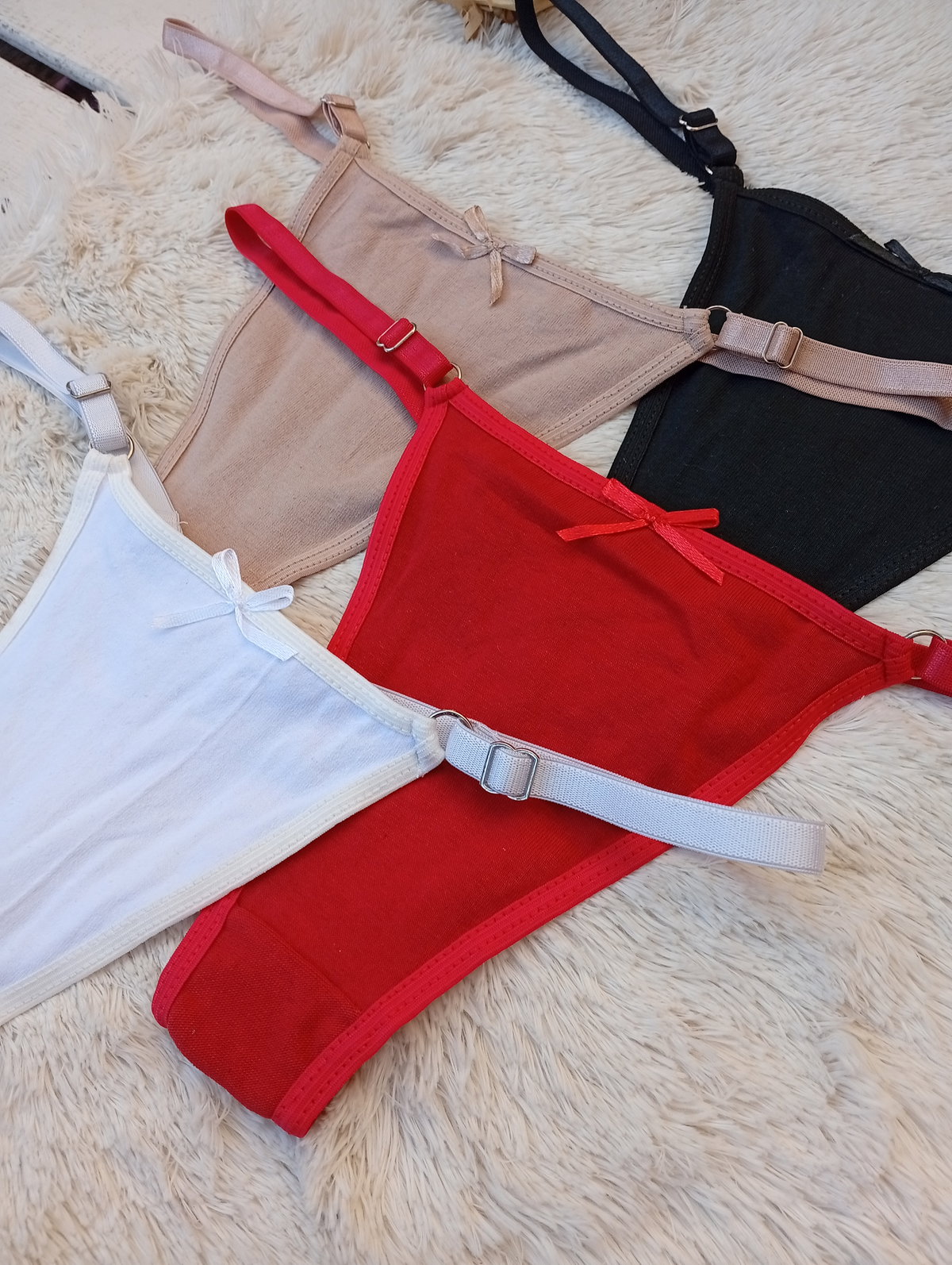 Son Less regulables de algodón. Tienen moño al tono.