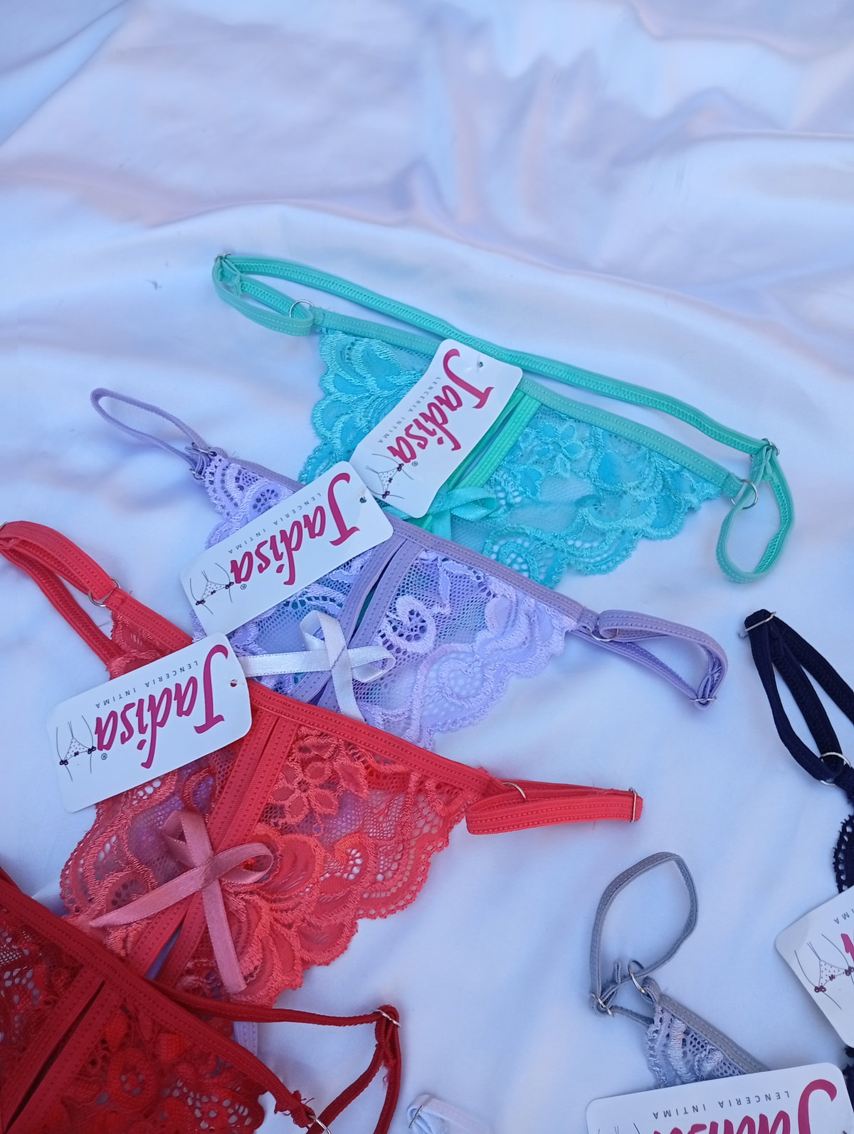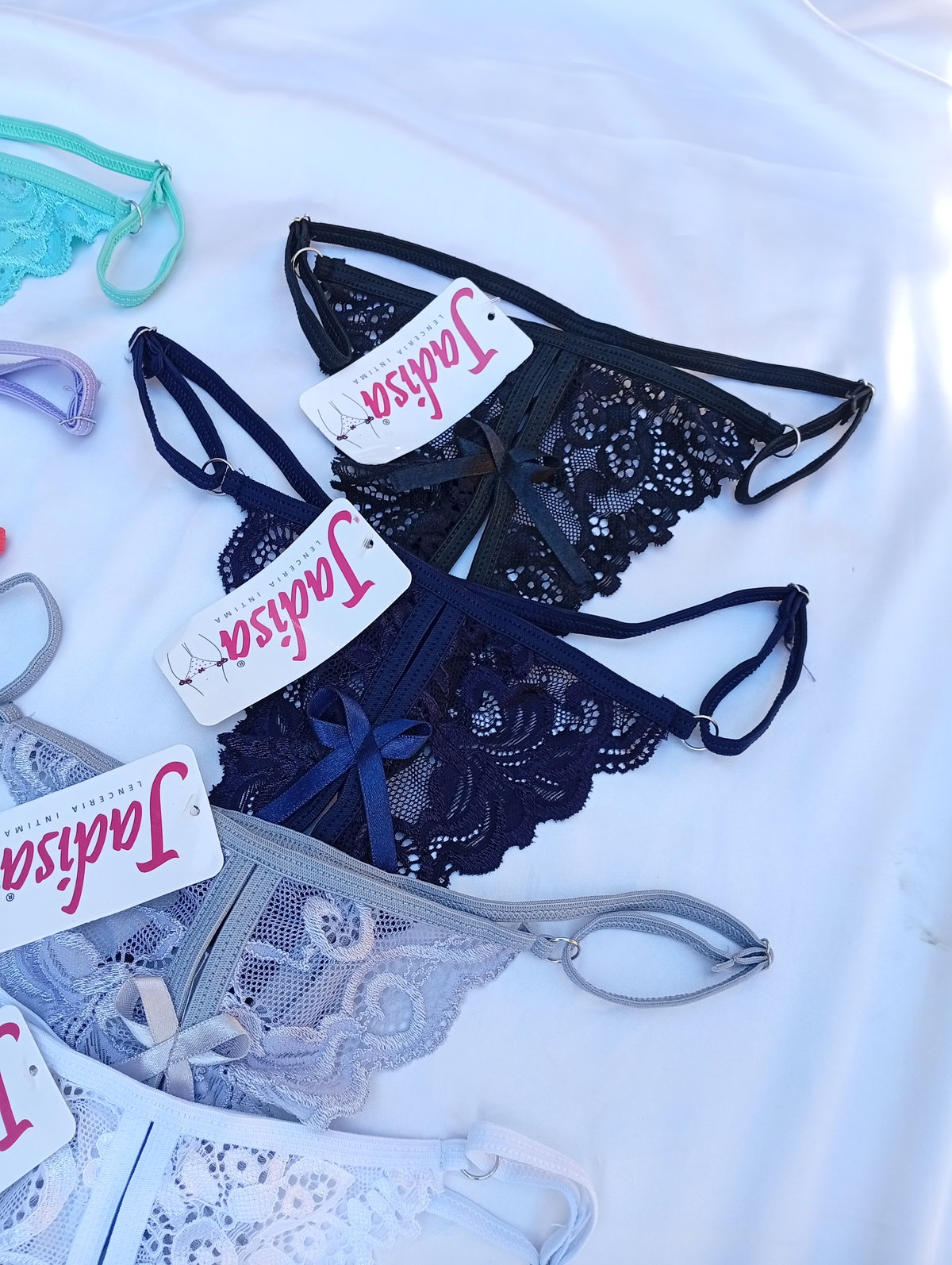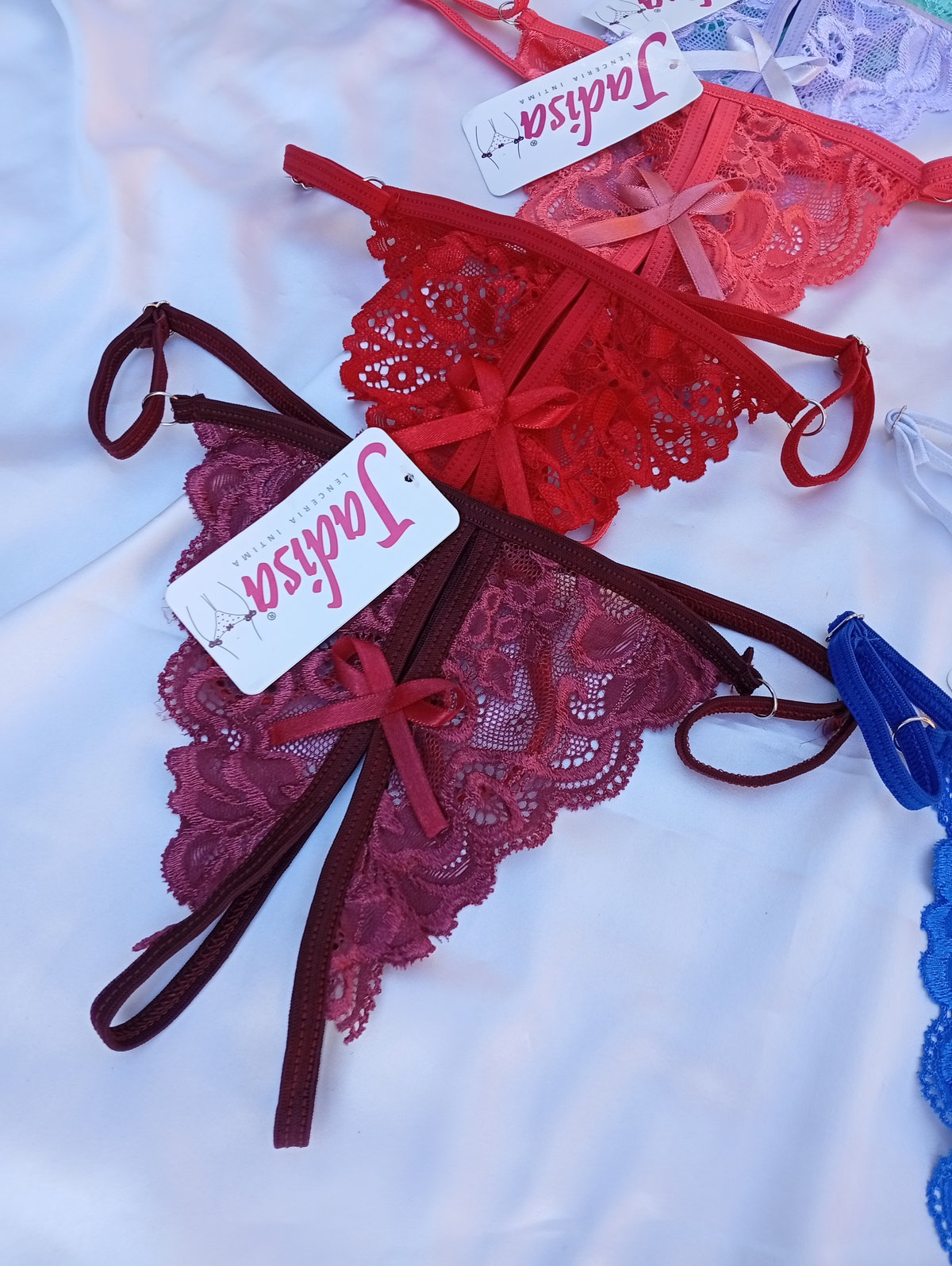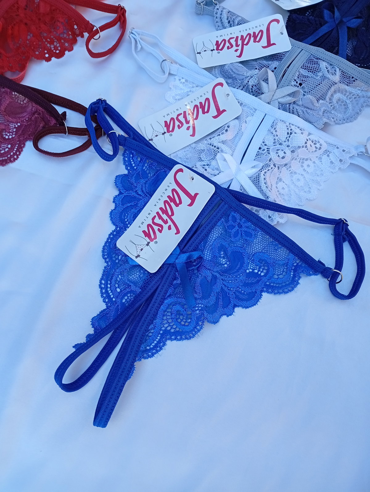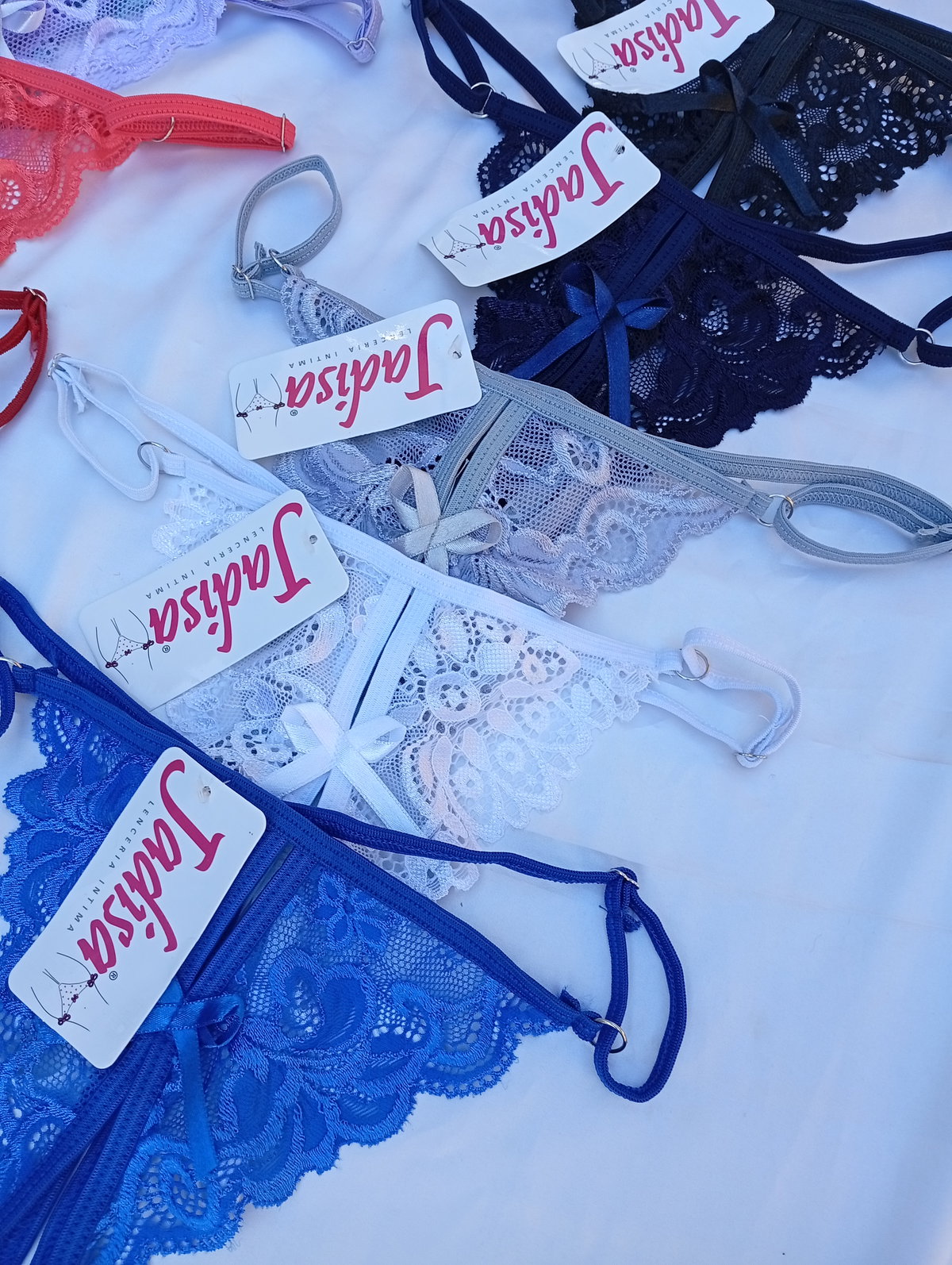 Bombis tanga rutera (mariposa) es abierto en el medio, y tipo tanga detrás. Talle único abarca del 36 al 40.