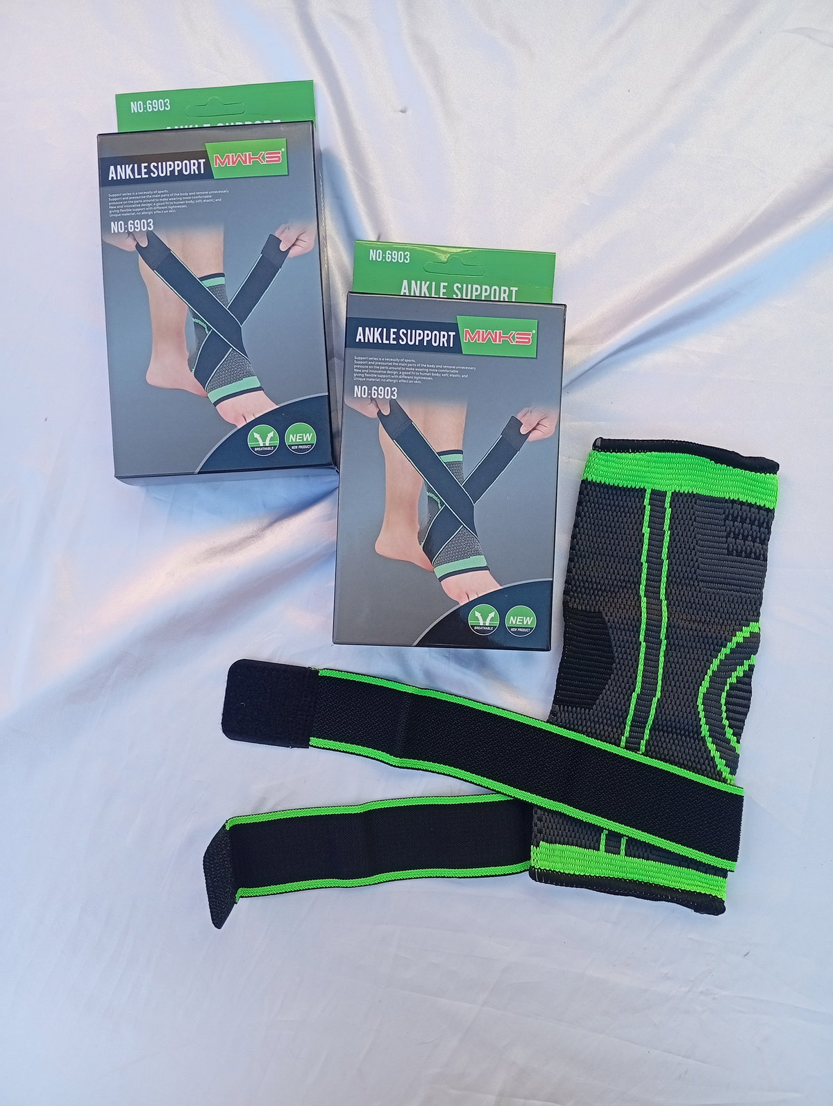 Esta tobillera elástica con soporte y bandas ajustables de la marca Miwke (modelo NO:6903) está diseñada para brindar estabilidad y compresión a la articulación del tobillo.